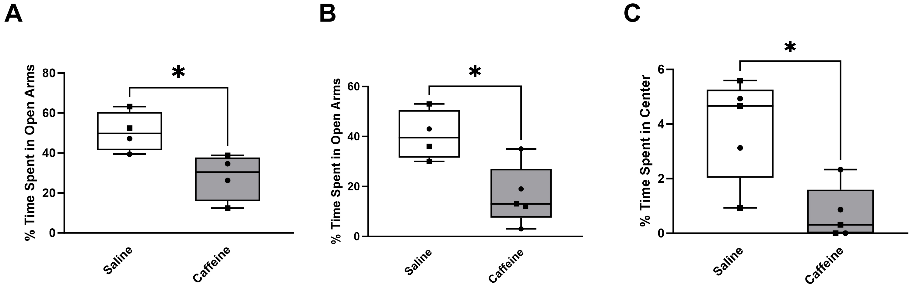 A separate cohort of rats was evaluated in the elevated zero maze as positive controls to a known anxiogenic agent, caffeine. Rats in the elevated zero maze that received a caffeine injection spent a median time of 30.47% in the open arms, which was significantly less (U = 0, p = 0.029) than those who received a saline injection, which spent a median time of 49.80% in the open arms (Fig. 6A). This behavior remained consistent even after 1 day of prior exposure to the maze (Fig. 6B). On the second day in the maze, the group treated with caffeine spent a median time of 13.13% in the open arms, which was significantly less (U = 2, p = 0.017) than the median time of 43.32% in the open arms spent by the group treated with saline. Rats evaluated in the open field test that received caffeine spent a median time of 0.31% in the center of the open field (Fig. 6C), in contrast to a median time of 4.66% spent in the center of the open field observed in the cohort who received saline (U = 1, p = 0.016).