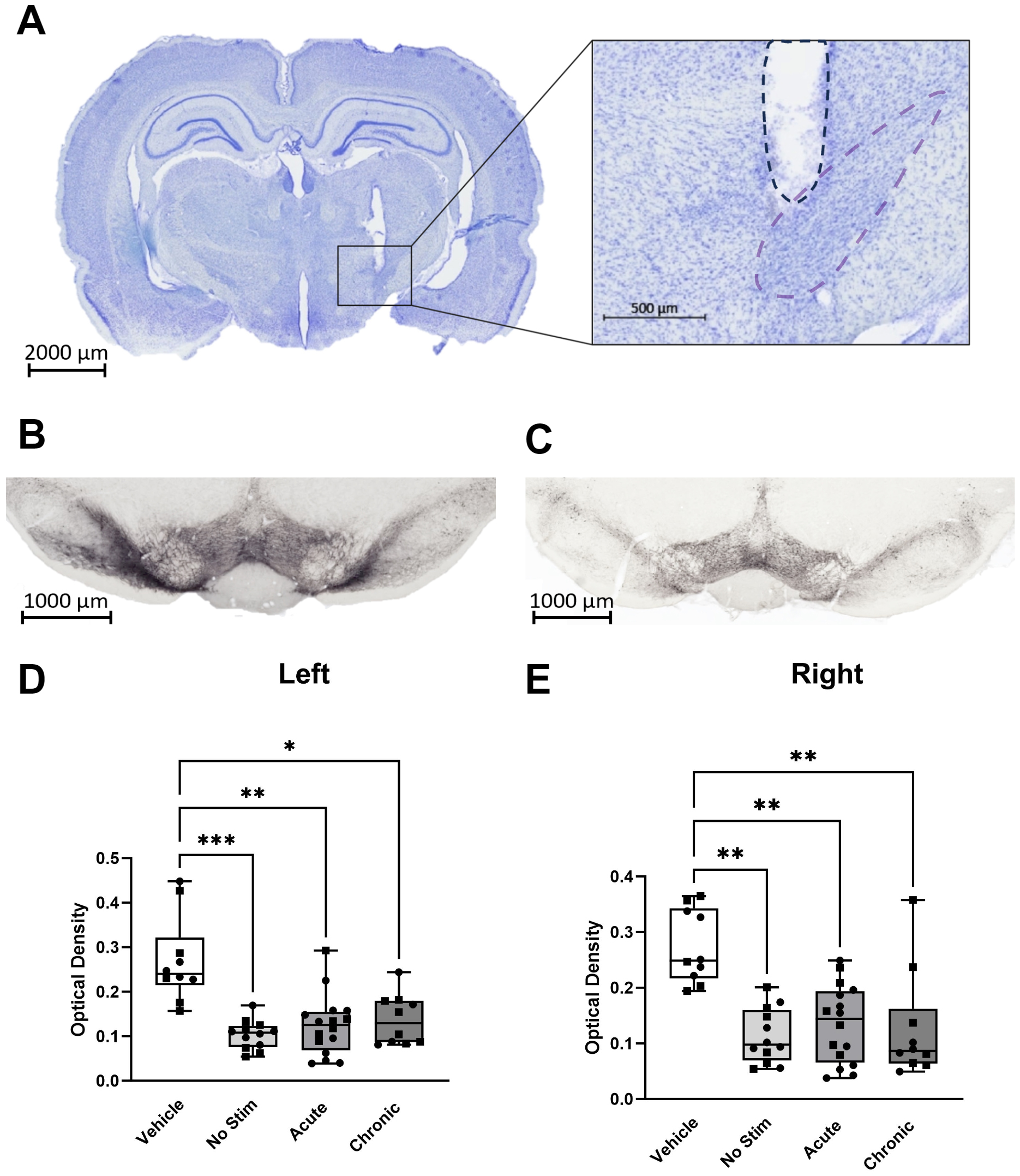 are located 5.88 mm posterior to the bregma [39]. (D) Optical density analysis of