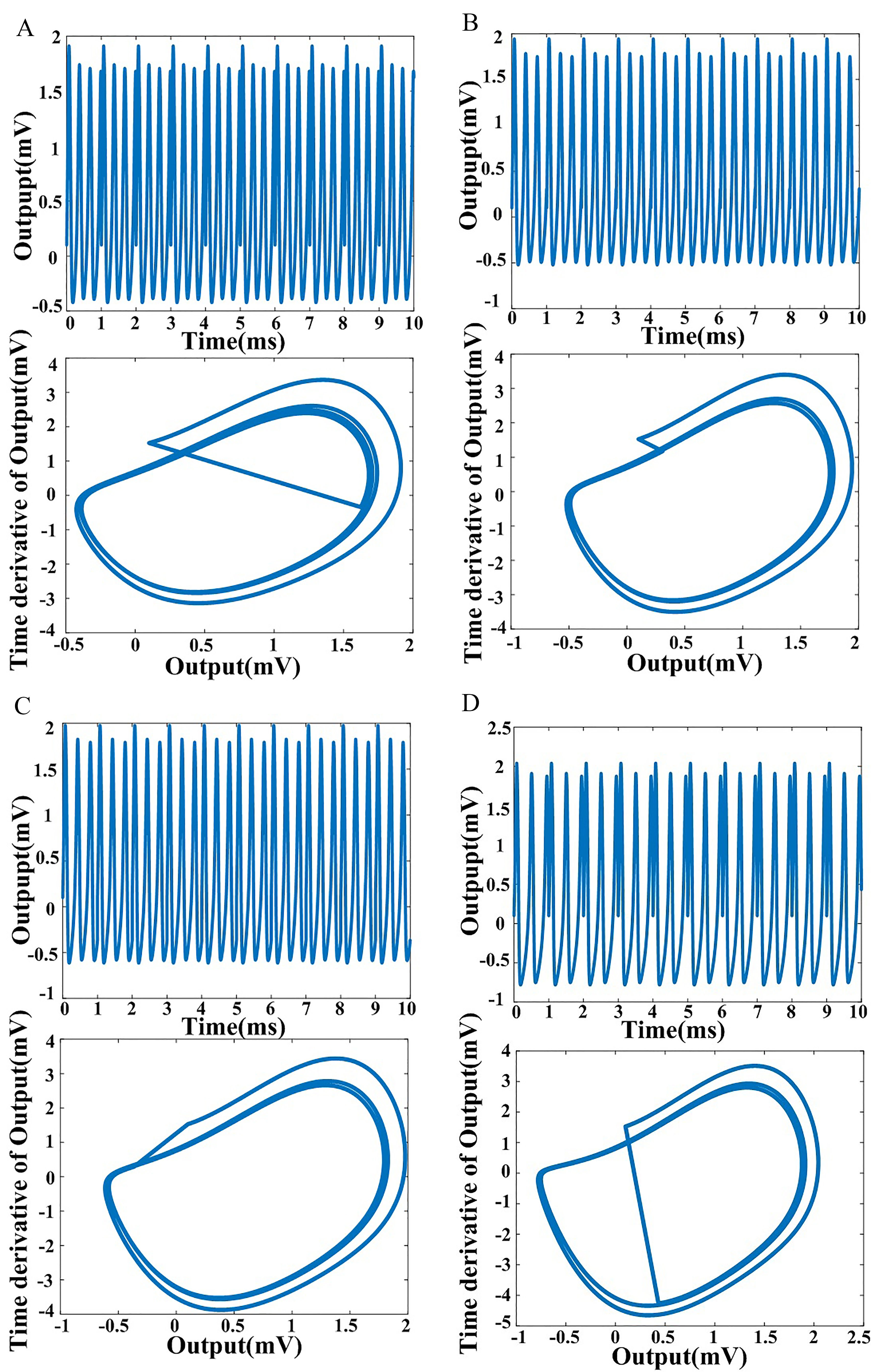 The CPG is a micro neural circuits and many mathematical models are used to present the dynamics of the CPG. In these models, Rybak model [37] incorporated several neuron types into a spinal circuit network. The model provided important insights into the organization of neural circuits in the spinal cord. Then the Rybak model [37] can be used for the further CPG modelling development. Frequency mixing and cross-frequency coupling in neural systems are models that also enable the sampling of sensory information [38]. The CPG functions as a rhythmic oscillator in the spinal cord capable of modulating patterns of locomotion and exhibiting a range of frequencies. Frequency mixing and cross-frequency coupling have previously been shown to enhance locomotion control in the brain [39, 40]. Further investigations focused on such frequency mixing and the frequency coupling in the context of locomotion control are thus warranted. Njitacke et al. [41] built a electronic circuit to study the dynamics of a 2D Hindmarsh–Rose neuron. Malik et al. [42] used Field Programmable Gate Array (FPGA) to investigate the behaviors of the fractional order biological neuron. Therefore, another further research field is the circuit implementation of these models in the paper.