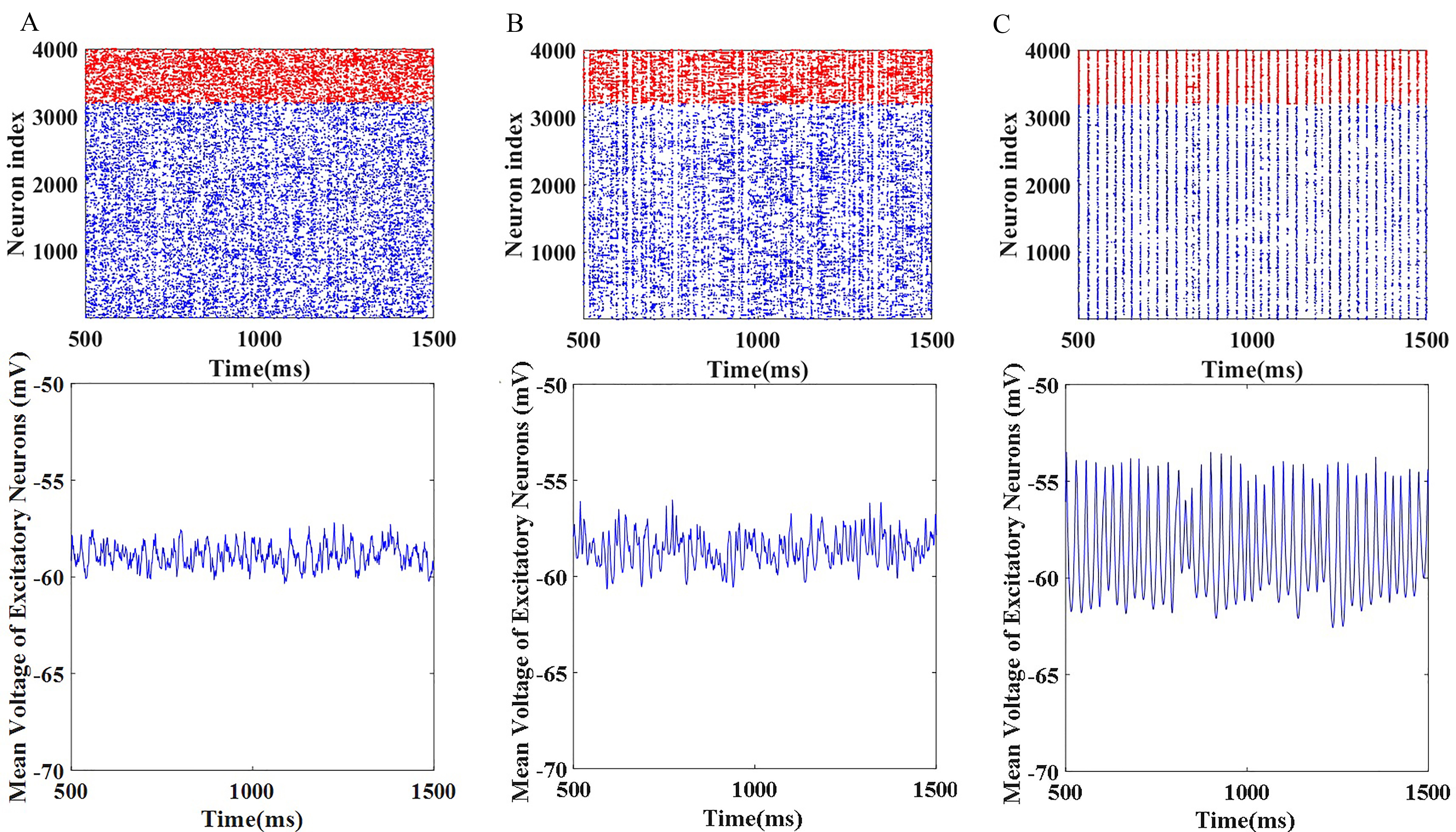 Neural oscillation has been reported across a range of temporospatial scales in the CNS [24, 25], serving as an important mechanism that facilitates the communication of information within sensory neural circuits [26, 27], with the frequency of such oscillation being sensitive to external inputs. sensory neural circuits, and its frequency can be modulated by external inputs. For example, awake-behaving macaques exhibit stimulus-dependent V1 cortical gamma oscillation [28], with changes in stimulus contrast over time contributing to reliable changes in gamma frequency on a fast time scale. Accordingly, neural oscillations and network responses were both taken into consideration in the present study. When modeling neural networks, a recurrent excitation-inhibition neuronal network can capture key features including neuronal, synaptic, and network properties [21]. As such, recurrent excitation-inhibition neuronal networks have been used by researchers interested in exploring a variety of cortical activities, including irregular firing, synchronized oscillations, and neuronal avalanches [20, 21, 22, 23]. A recurrent excitation-inhibition neuronal network was thus used to simulate the CNS in this study.