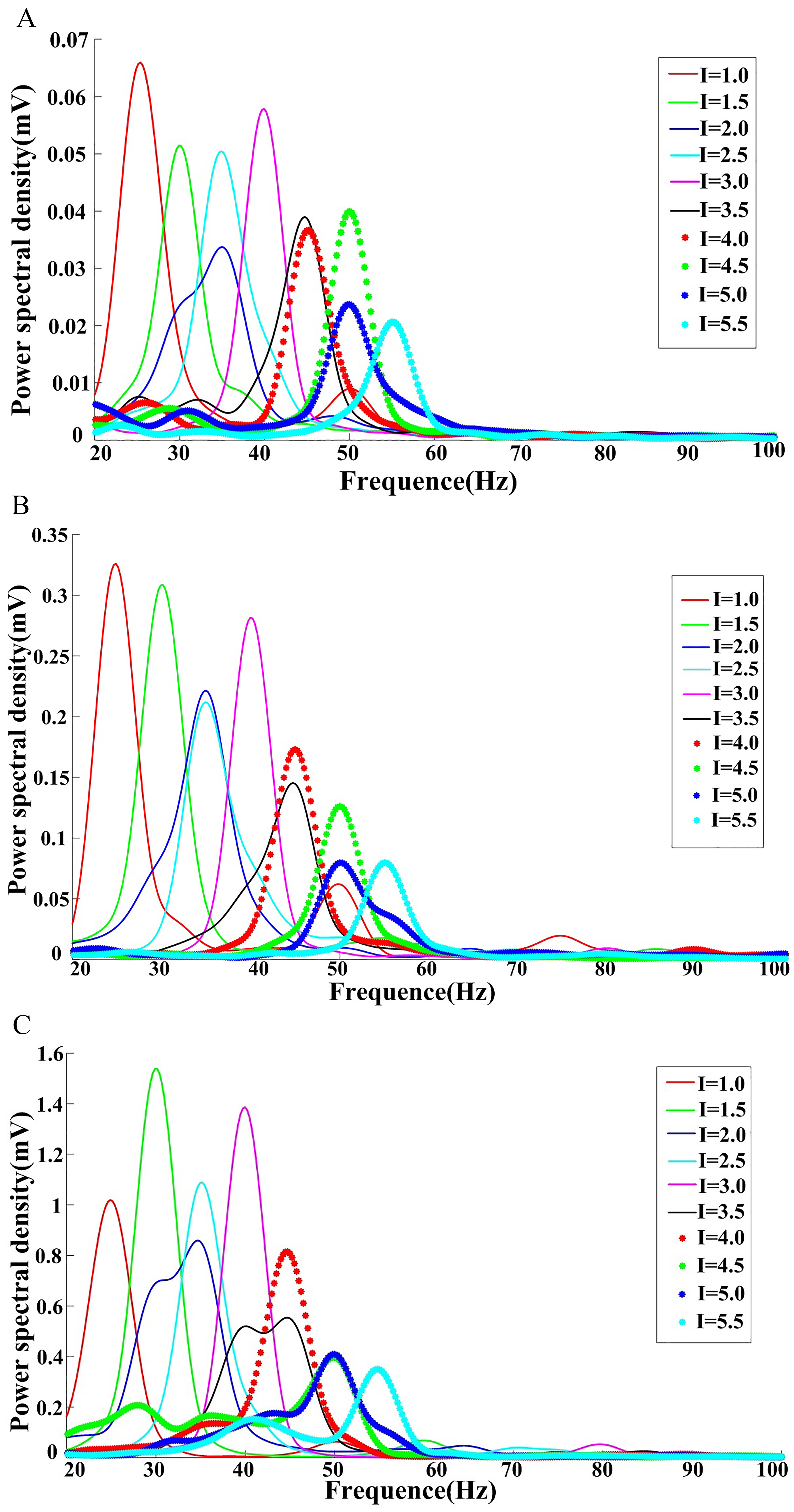 Fig. 4.Neural network power spectral density as a function of changes in the I value. Analyses were performed in the (A) subcritical, (B) critical, and (C) supercritical states.
