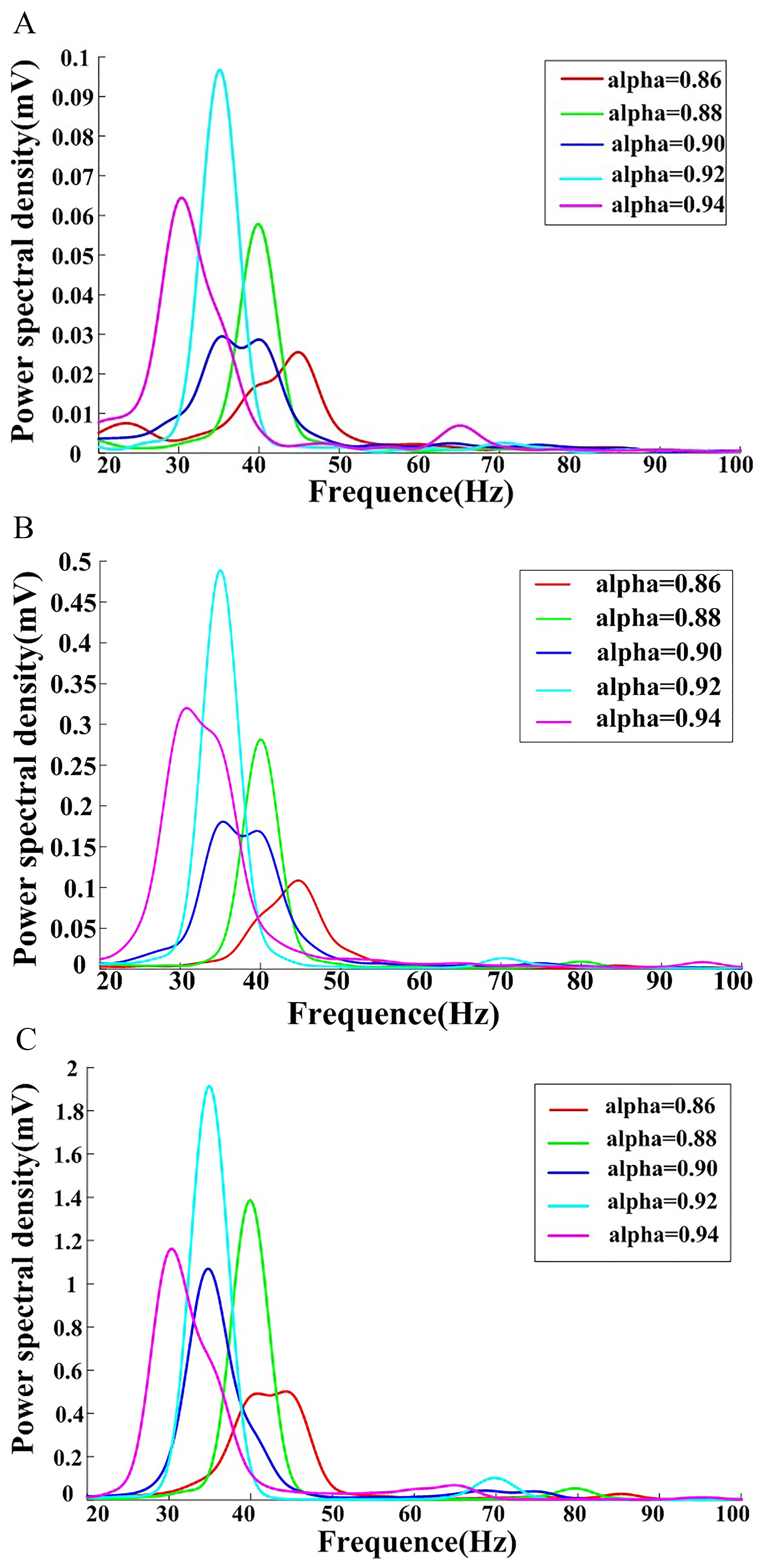 Fig. 5.Neural network power spectral density as a function of changes in the fractional-order index. Analyses were performed in the (A) subcritical, (B) critical, and (C) supercritical states.