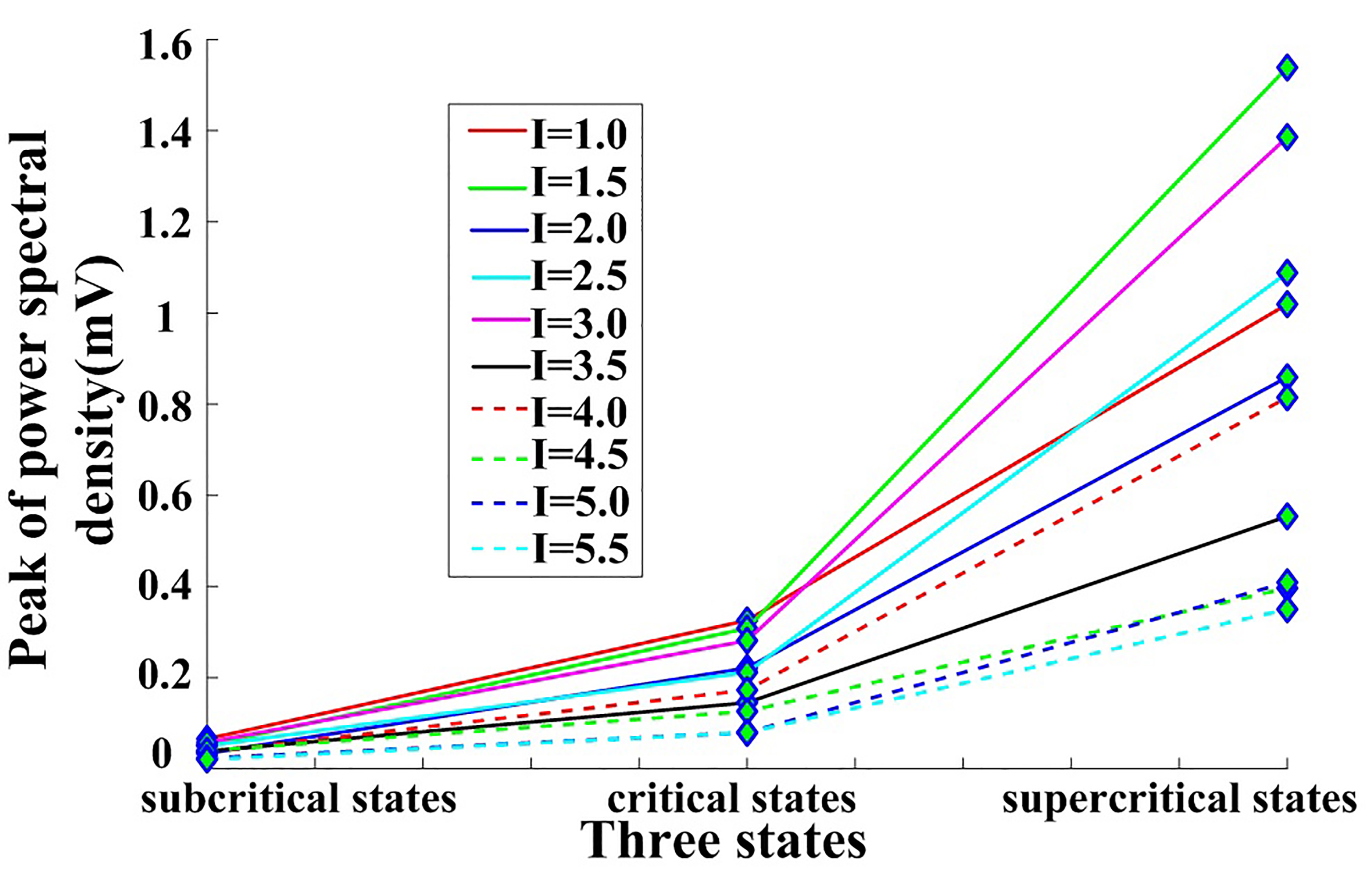 Fig. 8.Peak power spectral density for the neural network with changing I values in the subcritical, critical, and supercritical states. three states.