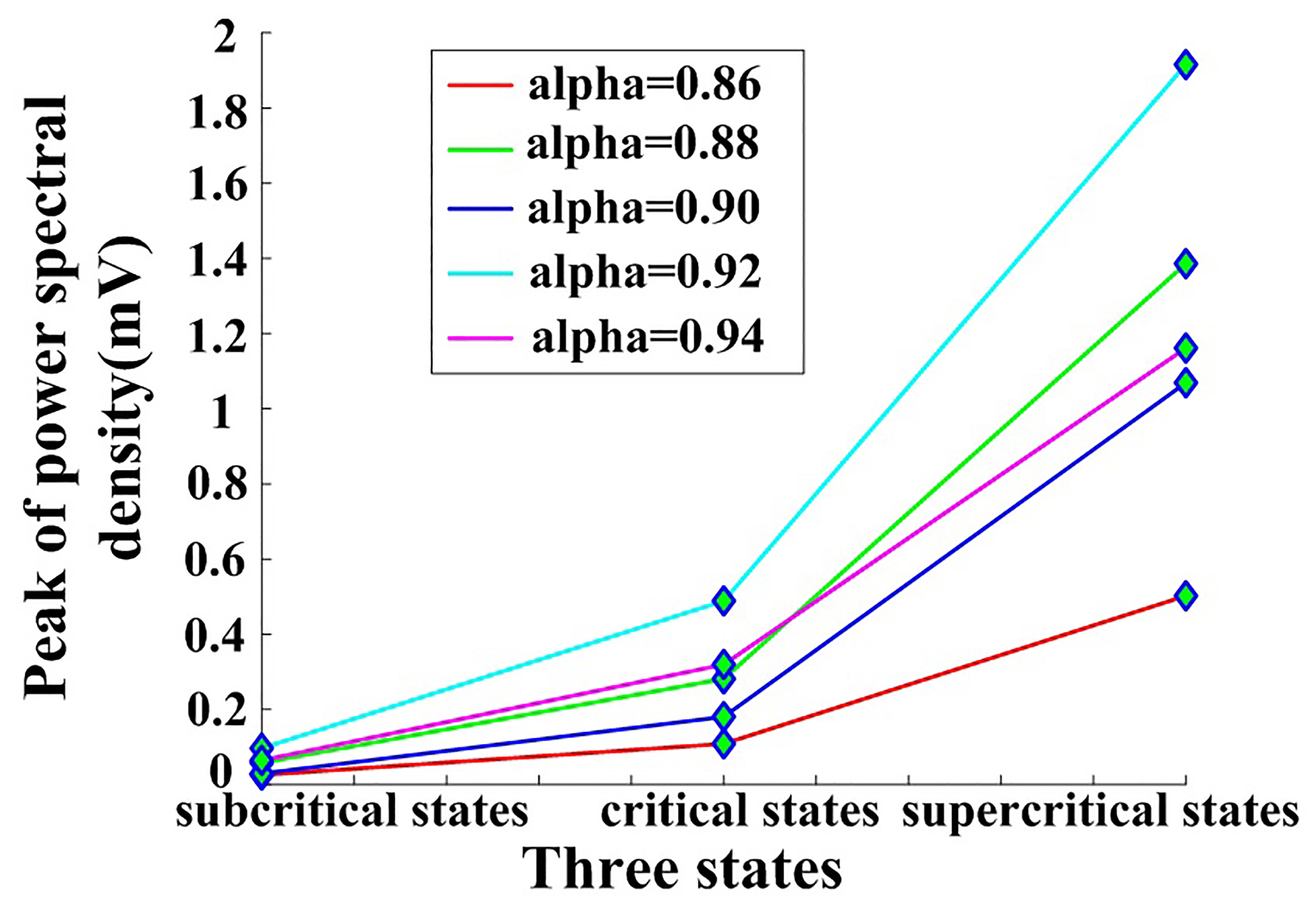 Fig. 7.Peak power spectral density for the neural network with changing fractional order index values in the subcritical, critical, and supercritical states.