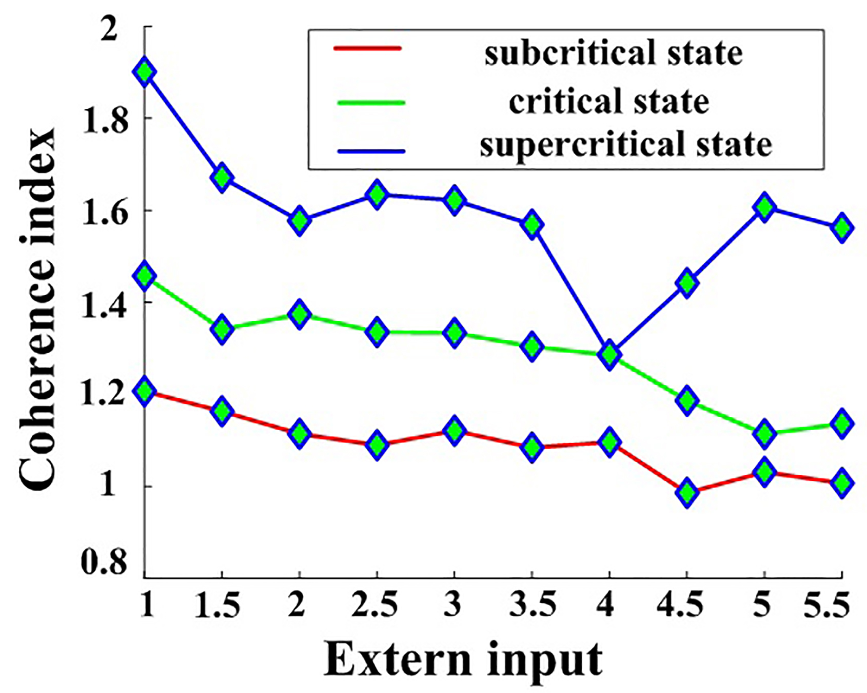 Although there is a minimum of coherence index in supercritical state, Fig. 8 shows a general trend that the coherence index decreases with increasing external inputs and a fixed fractional-order index of 0.88, indicating that increasing the external input will result in the desynchronization of neuronal oscillations in line with prior reports [23]. This is attributable to the greater stochasticity introduced by stronger external inputs, triggering a reduction in overall network synchronization and associated irregular neuronal firing.