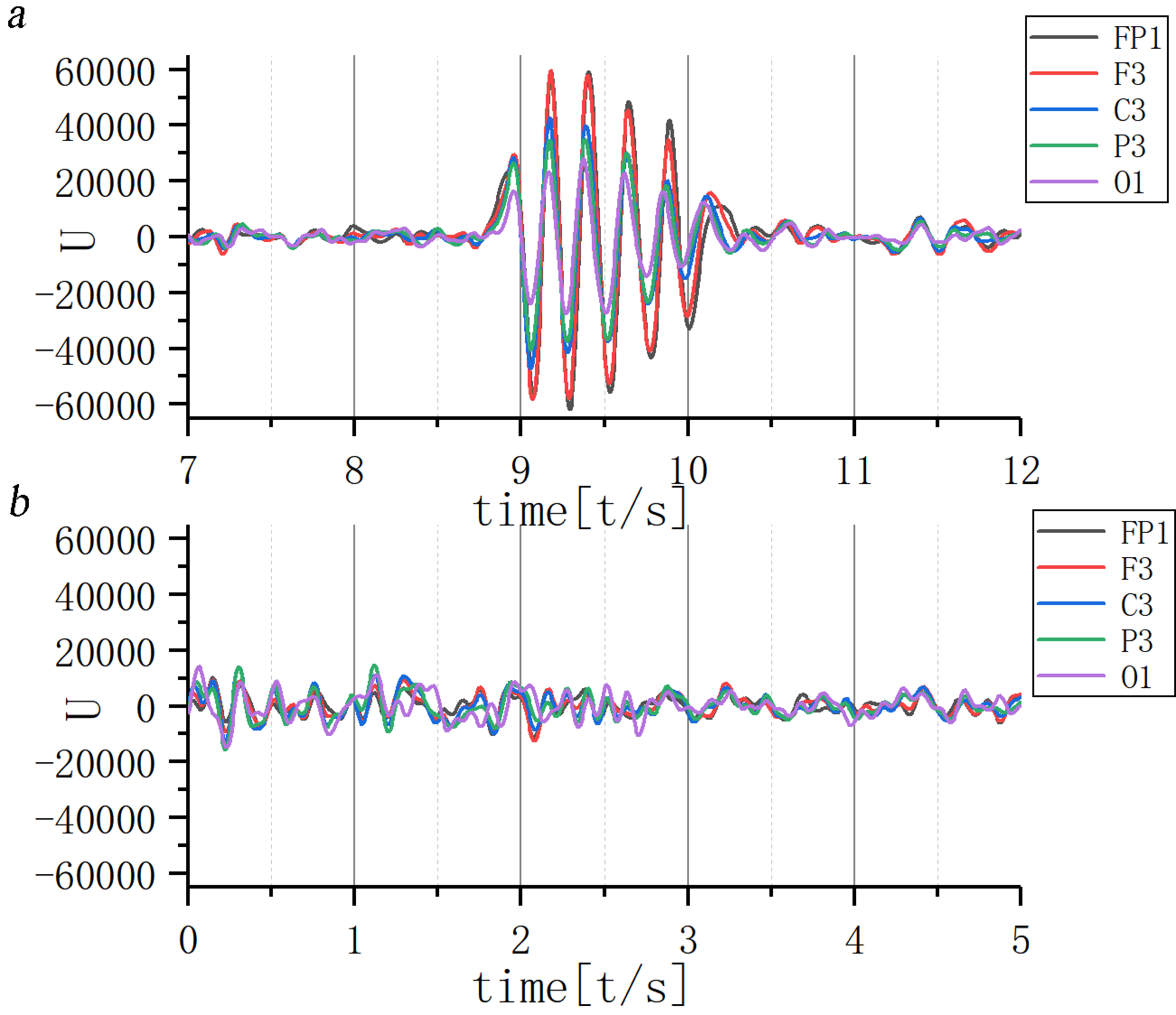 Fig. 10.Waveform of 11th scale for ictal EEG of (a) JME subjects and (b) normal controls. Note: U, Wavelet coefficients.