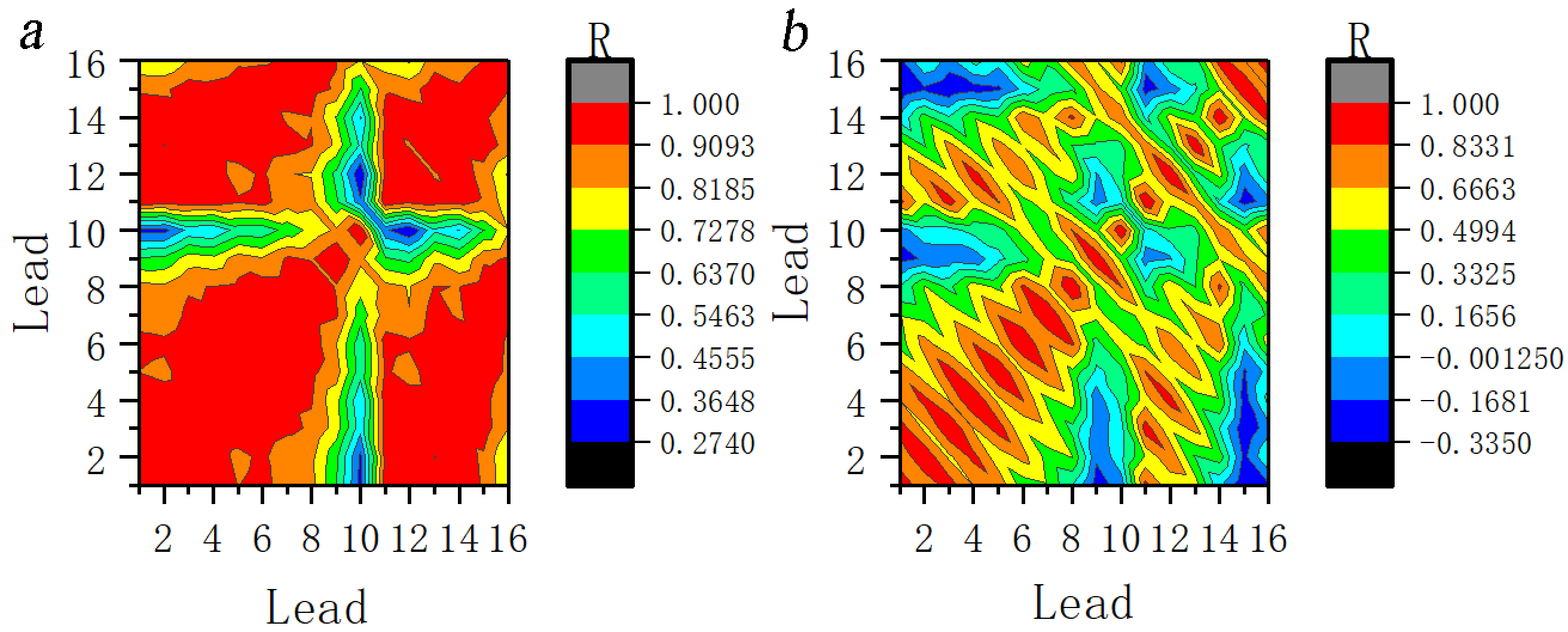 Fig. 12.Correlation coefficients between the leads at 11th scale for ictal EEG of (a) JME subjects and (b) normal controls. Note: Lead 1–Lead 16 correspond to FP1–T6; R, Correlation coefficients.