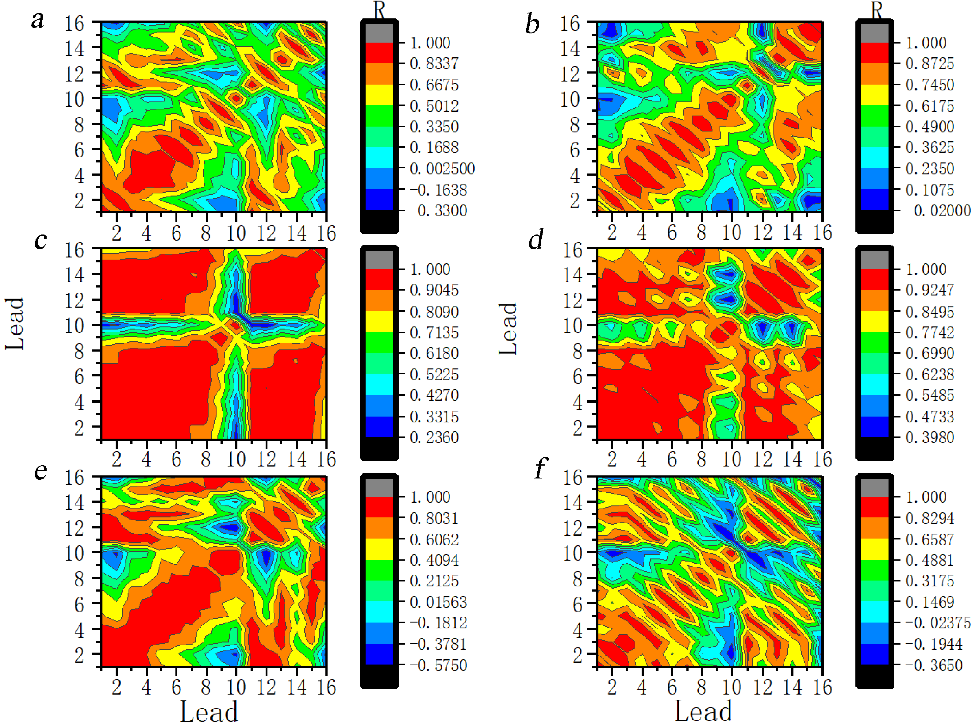 Fig. 14.Dynamic evolution of correlation coefficients between the leads at the 17th scale for ictal EEG of JME subjects. Note: Lead 1–Lead 16 correspond to FP1–T6. (a) 2 s before seizure. (b) 1 s before seizure. (c) The first second of the seizure. (d) The 2 s of the seizure. (e) 1 s after seizure. (f) 2 s after seizure. R, Correlation coefficients.