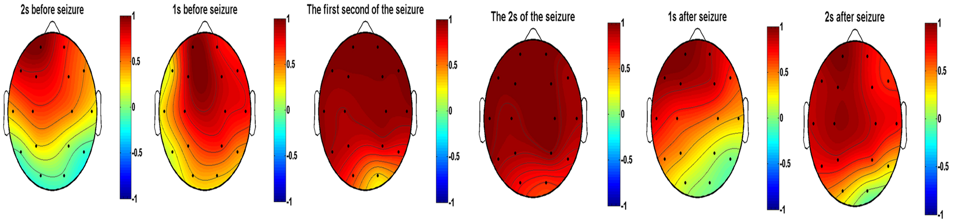 Seizure was segmented into one second intervals and the coefficient of correlation was calculated between different leads (Fig. 13). Two seconds prior to the seizure, the range of leads with a significant positive correlation in the anterior head gradually increased and the correlation between the posterior and anterior head leads gradually changed from no correlation to a mild positive correlation. The correlation increased significantly during the one to two seconds of the seizure. In the subsequent one to two seconds after a seizure, the range of leads with significantly higher correlations gradually decreased. Additionally, the coefficient of correlation gradually decreased and returned to preictal magnitude.