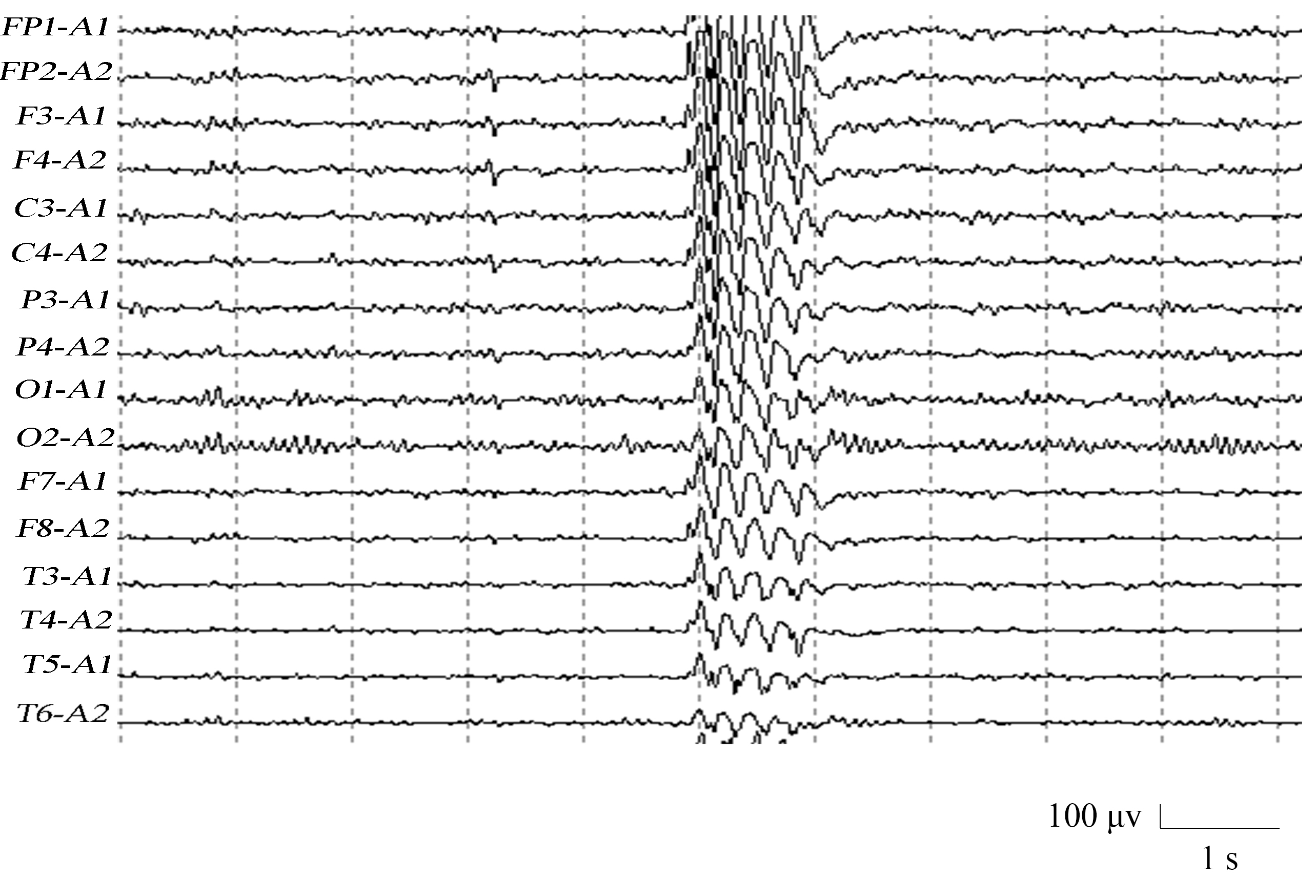 Fig. 2 shows the EEG of a JME subject. It shows a whole-brain burst of 4 Hz high amplitude spike-wave, which lasts for approximately one second. This was followed by a return to the background wave rhythm. The EEG signal JME subjects during seizure exhibited a spike-wave with higher amplitude in the frontal central region.
