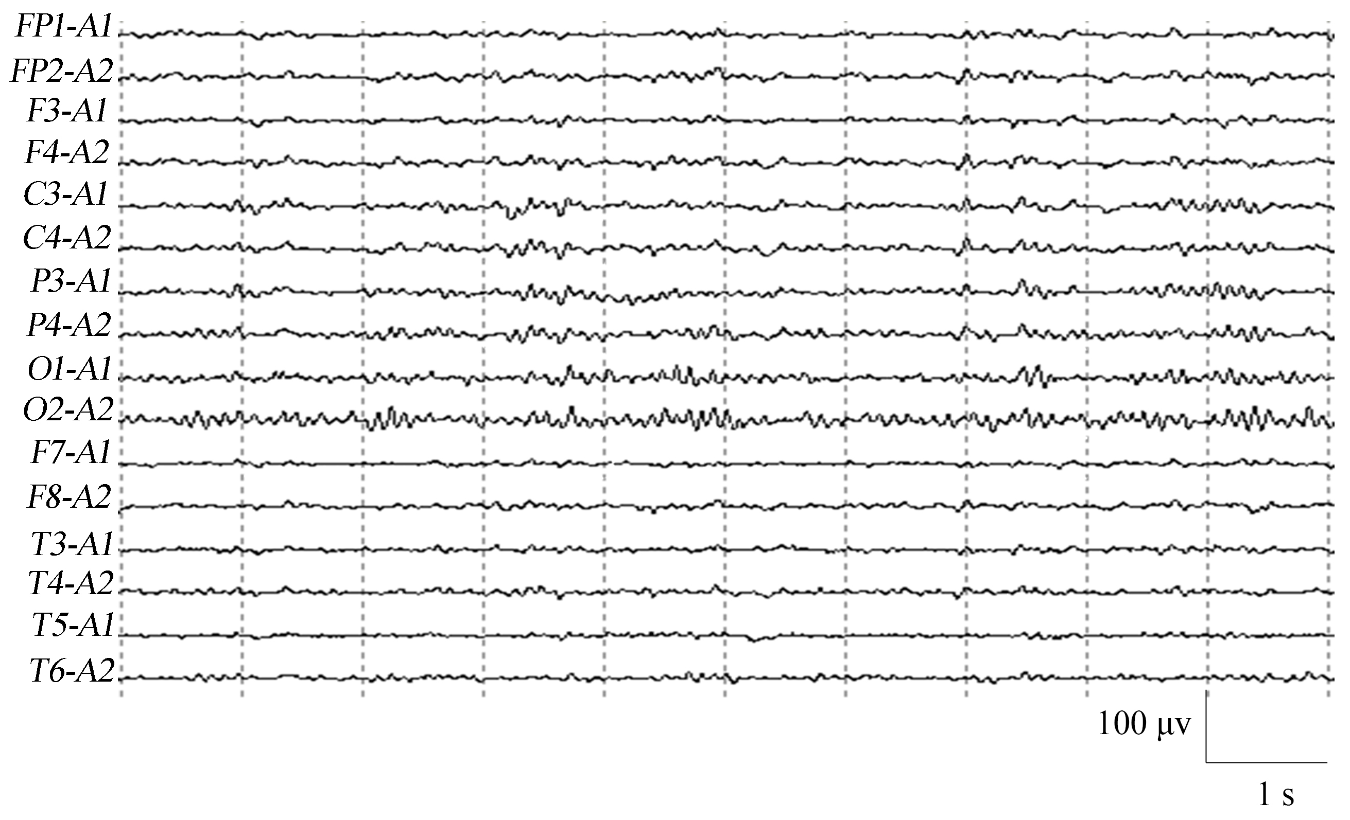Fig. 3 shows a normal control EEG signal with an occipital rhythm, which is dominated by an 8–10 Hz alpha rhythm with several beta waves in between. It is bilaterally symmetrical and well-modulated.