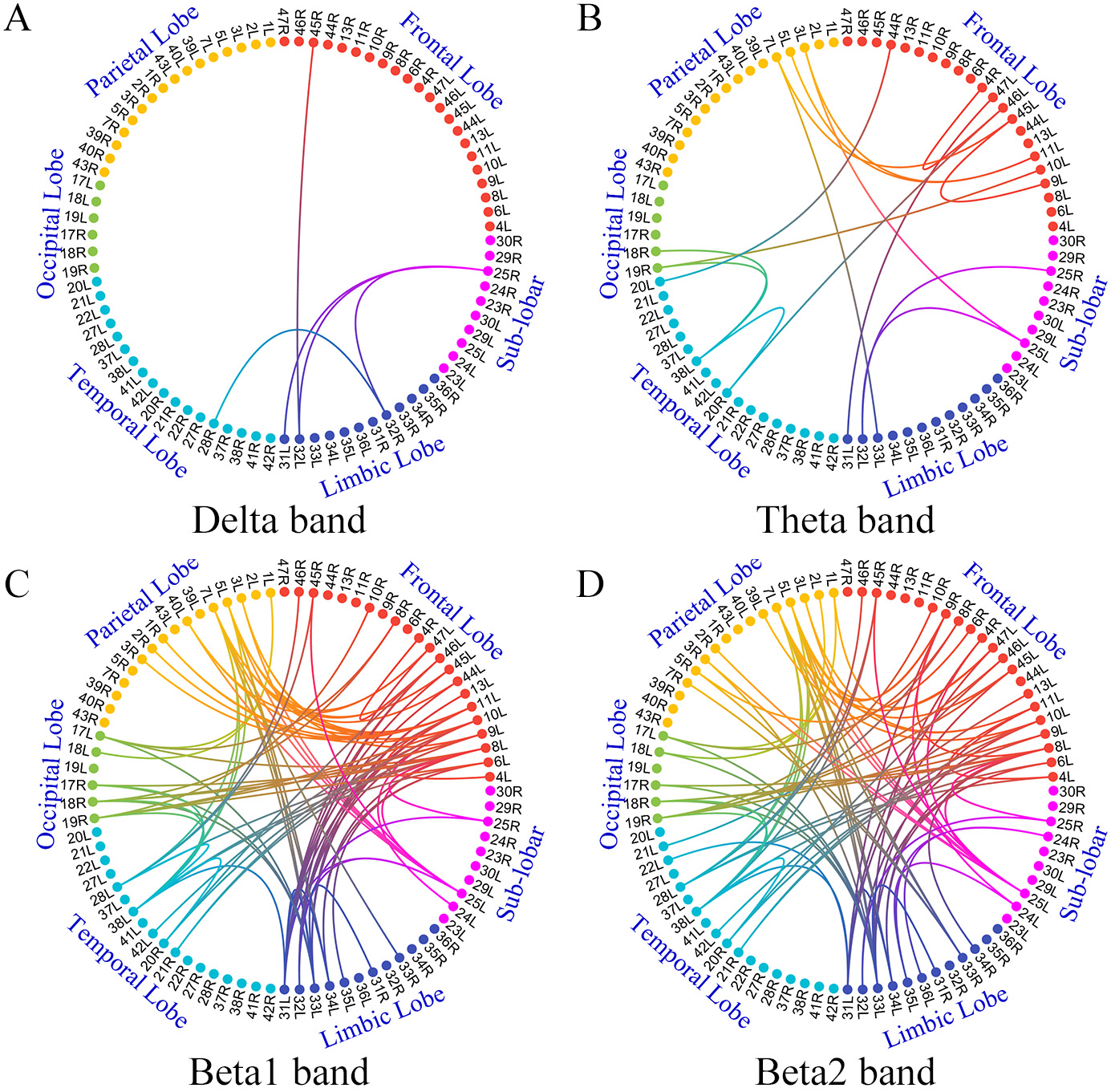 The large-scale FC was compared between anti-NMDAR encephalitis patients and HCs based on the 84 brodmann area (BA) ROIs. Few edges in delta and theta bands showed increased FC and a large number of edges in beta 1 and beta 2 bands showed increased FC in patients having anti-NMDAR encephalitis (Fig. 1). For other frequency bands, no significant differences in FC were found between the two groups. No decrease in FC was observed in participants, compared with HC.
