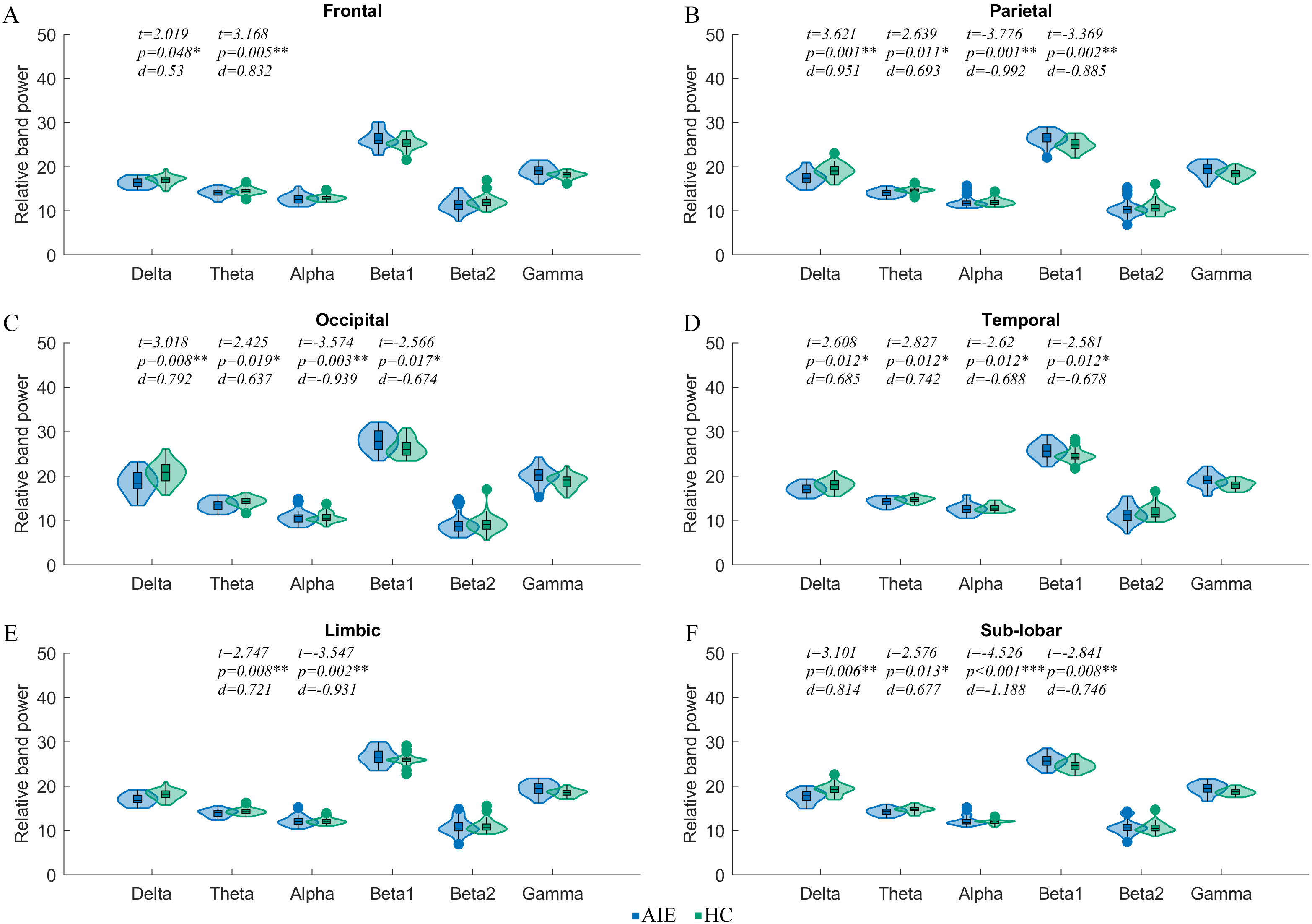 Compared with the HC group, the AIE group showed increased delta and theta RBP in frontal, parietal, occipital, temporal and sub-lobar lobes. However, the RBP of alpha and beta 1 bands in parietal, occipital, temporal and sub-lobar lobes decreased in anti NMDAR encephalitis patients. Additionally, compared with the HC group, the theta band RBP increased while the alpha band RBP decreased in the limbic system of patients (Fig. 3).