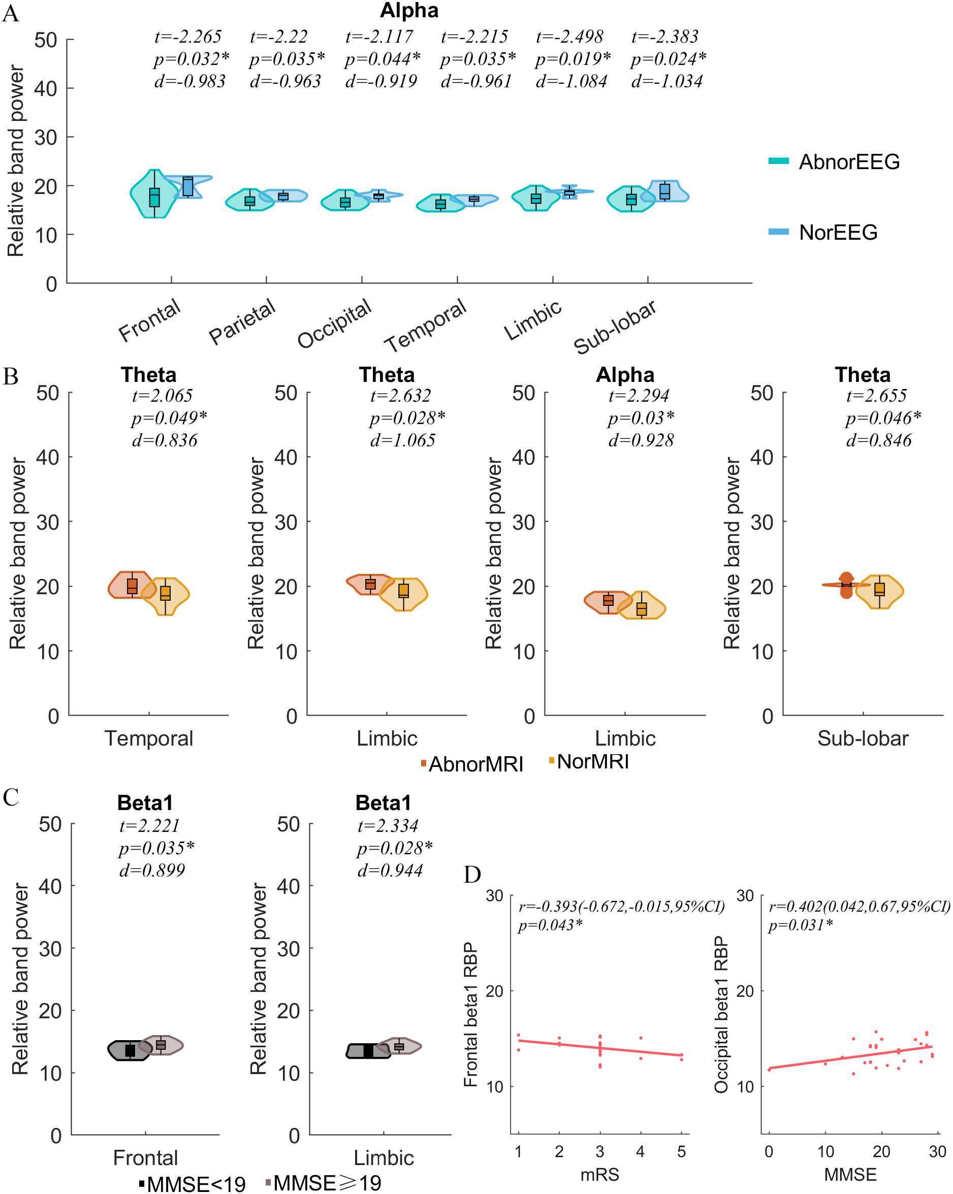 When sub-groups were partitioned by EEG pattern, MRI pattern and MMSE scores, significant differences were observed in the RBP of some brain areas. Comparing the AIE group with the normal EEG pattern, AIE participants with abnormal EEG pattern showed decreased alpha RBP in the whole brain. Additionally, those AIE participants with abnormal MRI showed significantly increased theta RBP in temporal, limbic and sub-lobar systems. The alpha RBP in limbic systems also increased significantly in these participants, compared with those with a normal MRI. Moreover, compared with those participants showing higher MMSE, those with a lower MMSE showed increased beta 1 RBP in the frontal lobe and limbic system (Fig. 4). Other parameters we did not mention including both source localization-based and scalp EEG-based graph parameters showed no significant differences in these subgroups.