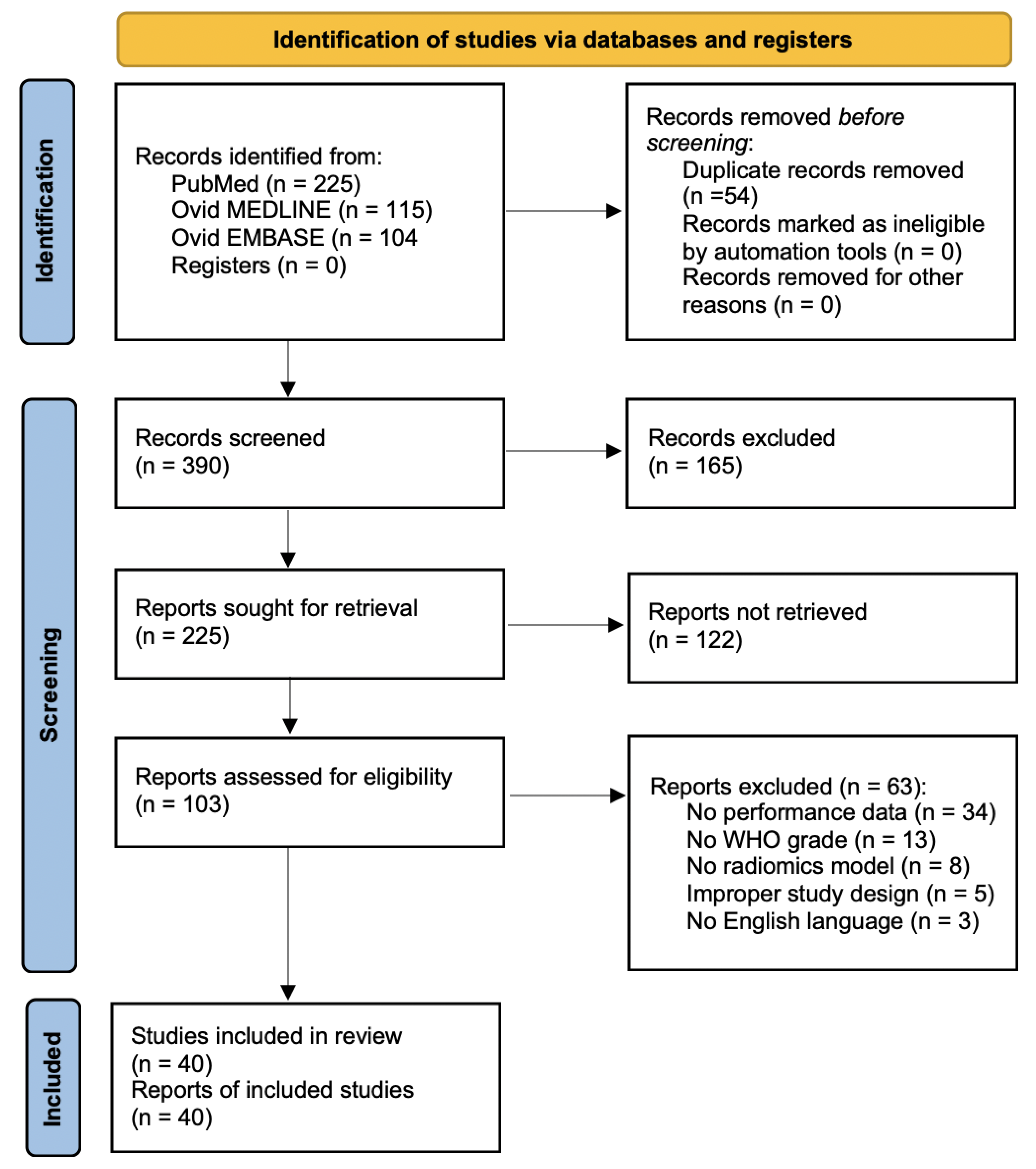 After duplicates were eliminated, 390 papers were found. 103 articles were found for full-text study following the analysis of the titles and abstracts. Forty papers were evaluated for eligibility. The following criteria led to the exclusion of the remaining 63 articles: (1) studies not reporting data on radiomics performance for glioma grading (34 articles), (2) studies not reporting the WHO grade (13 articles), (3) studies reporting on AI-based models other than radiomics (8 articles), (4) improper study design (5 articles), and (5) language other than English (3 articles). The Authors of three included articles [17, 18, 19] provided missing performance data and the results were integrated into the data abstraction process. For each of the patient groups under consideration, at least one or more outcome measures were available for all of the studies that were part of the analysis. The PRISMA statement’s flow chart is seen in Fig. 1.