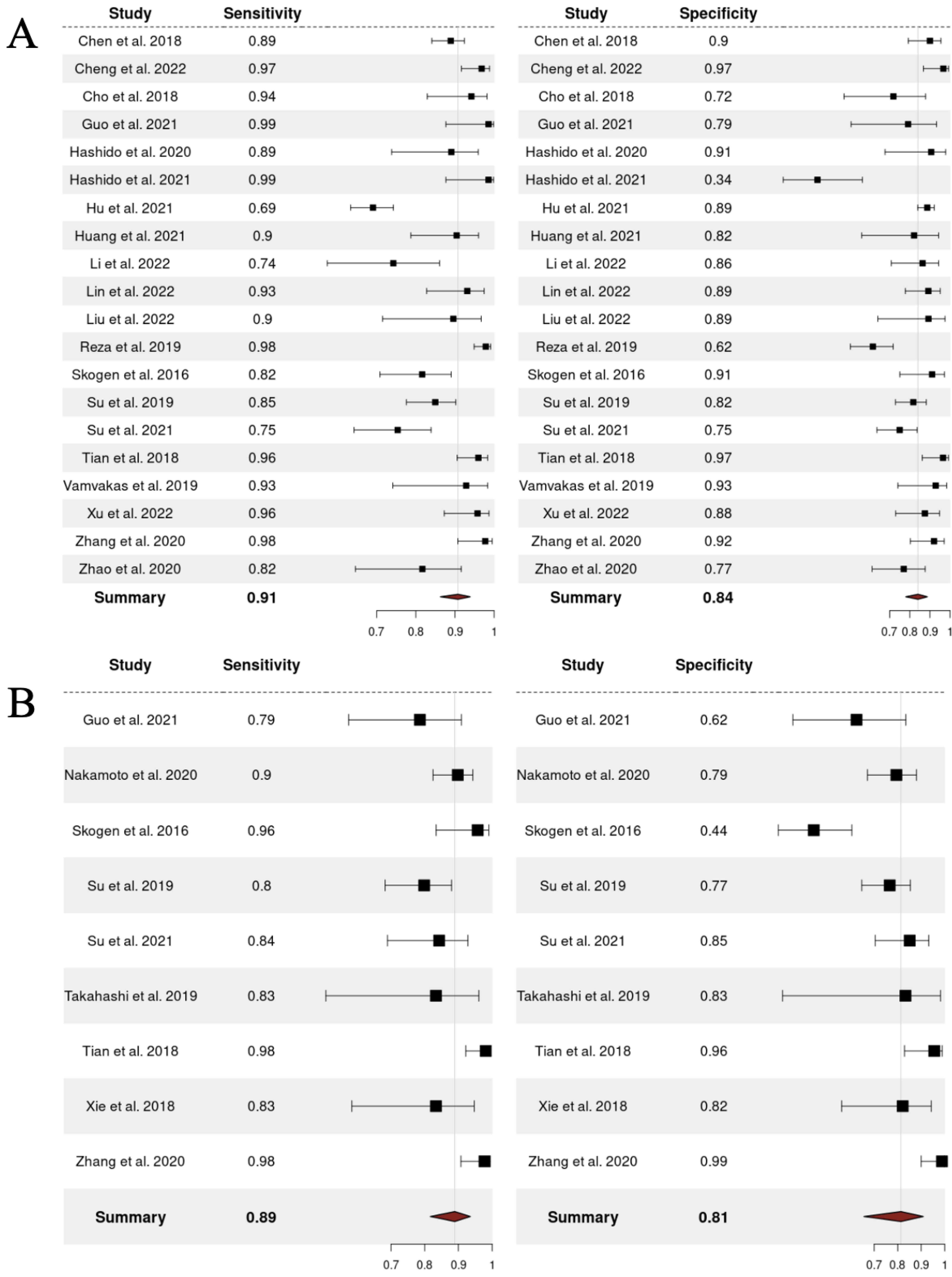 Fig. 2.Forest plots for discrimination between LGGs vs. HGGs (A) and grade 3 vs. grade 4 gliomas (B). The red diamonds represent the overall results.
