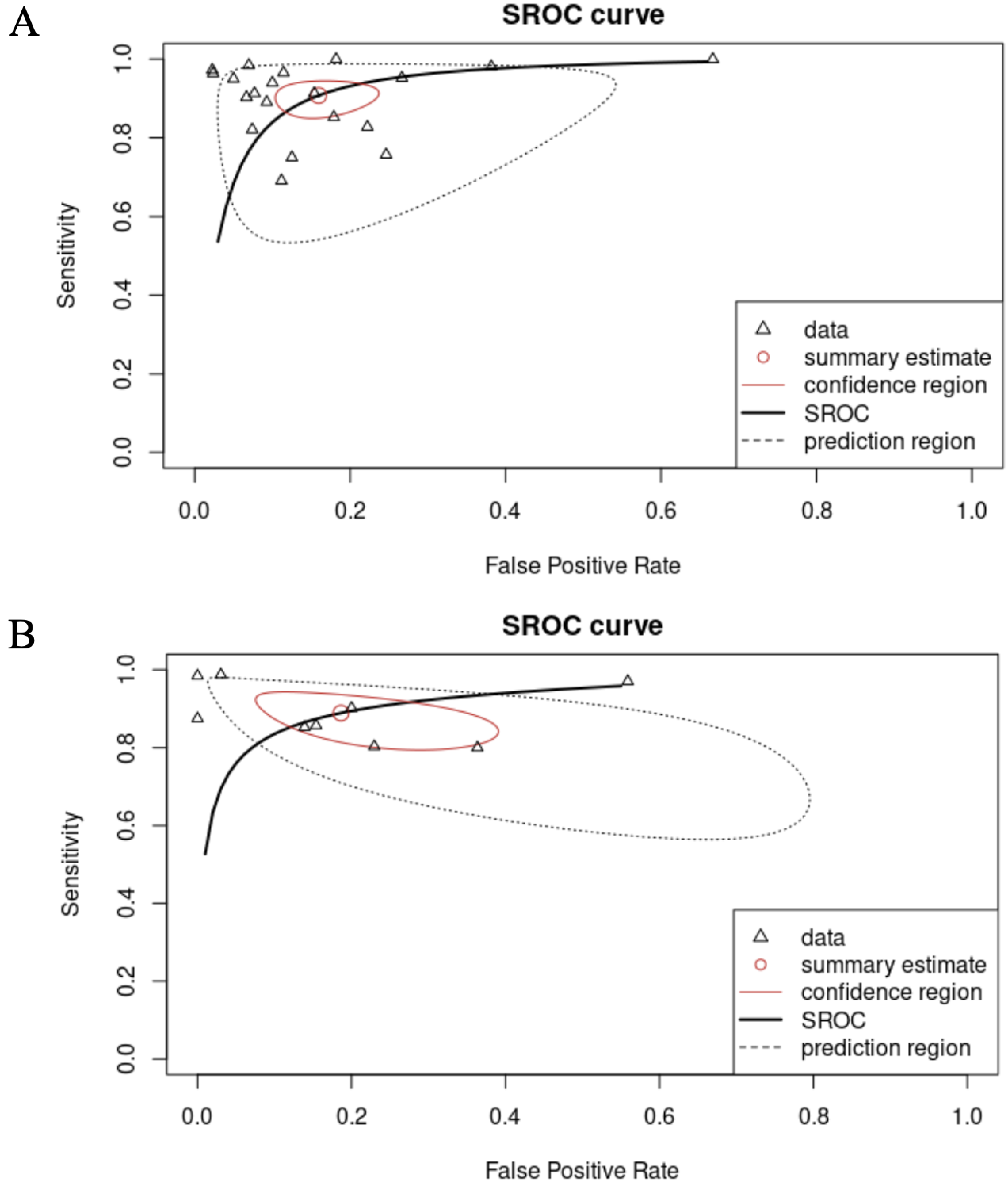 Fig. 3.SROC curves for the differentiation between LGGs vs. HGGs (A) and grade 3 vs. grade 4 gliomas (B). Each curve provides: (i) the summary estimate of the considered study (see the red circle); (ii) the confidence region of the summary estimate (see the red ellipse-like trace), which furnishes a measure of the performance heterogeneity among the included studies; (iii) the prediction region for a new hypothetical study, where it is likely to expect a new study (see the dashed line). Abbreviations: SROC, summary receiver operating characteristic.