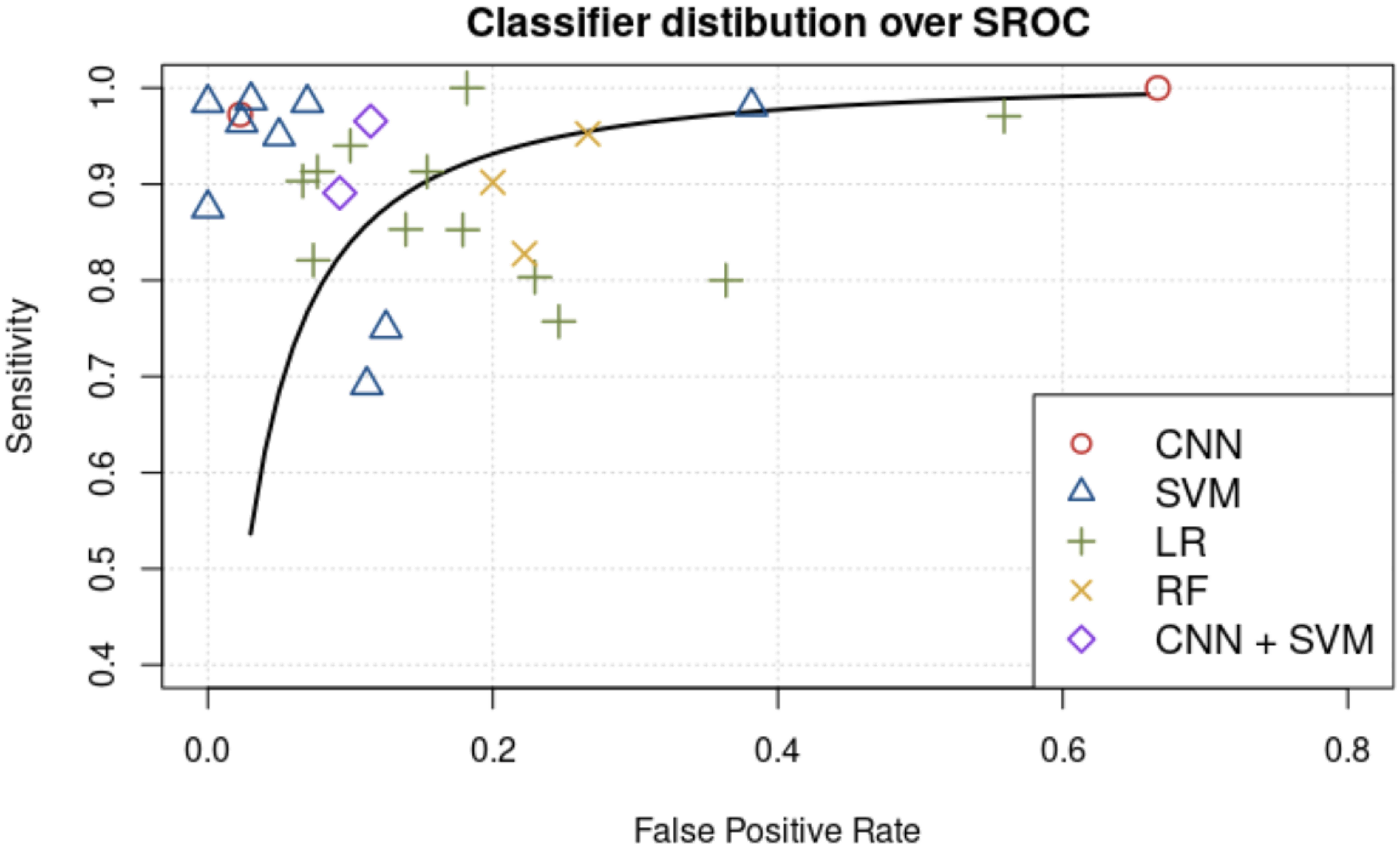 Fig. 4.SROC curve for the two classification tasks considered together. From this graph, we can assess that the non-linear classifiers tend to perform better with respect to simpler solutions such as logistic regression classifiers. This can be evinced from the position of the non-linear classifiers (CNN, SVM, RF, and CNN + SVM) which are more towards the top-left corner of the graph, with respect to the linear (LR).