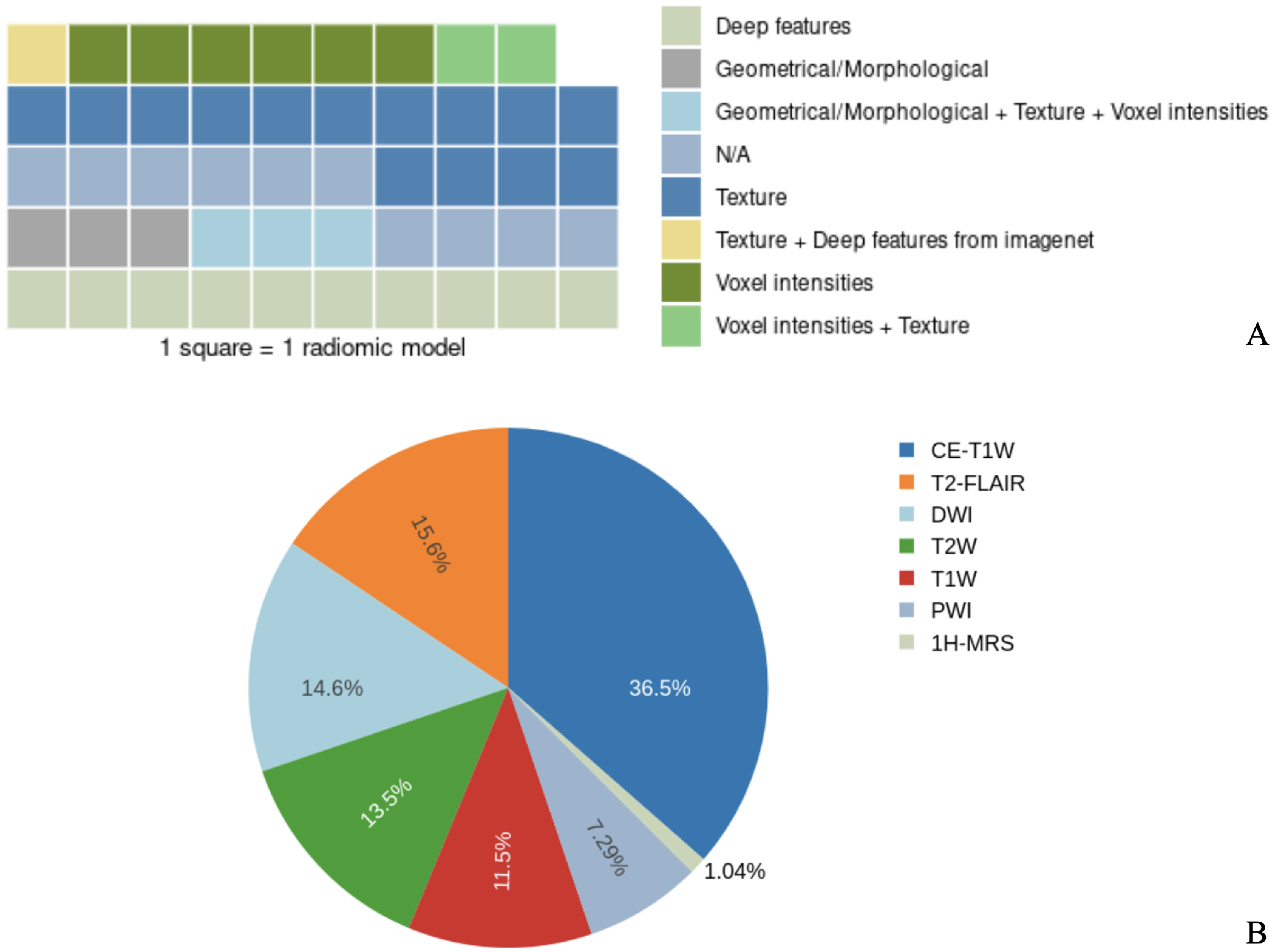 Fig. 5.Radiomics features. (A) A visual representation of the radiomics features distribution among the studies included in our review. Each square corresponds to the features fed as input to a single radiomic model. Note that in a single study, more than one radiomic model may be described, each one tailoring a different and specific classification task. A final remark must be made concerning the so-called “deep features from Imagenet”. This is indeed a widely used data representation in the context of deep learning, as detailed in the corresponding studies. (B) Pie chart showing the distribution of the MRI modalities among the included studies. Note that a single radiomic model may be fed with data obtained from different MRI modalities.