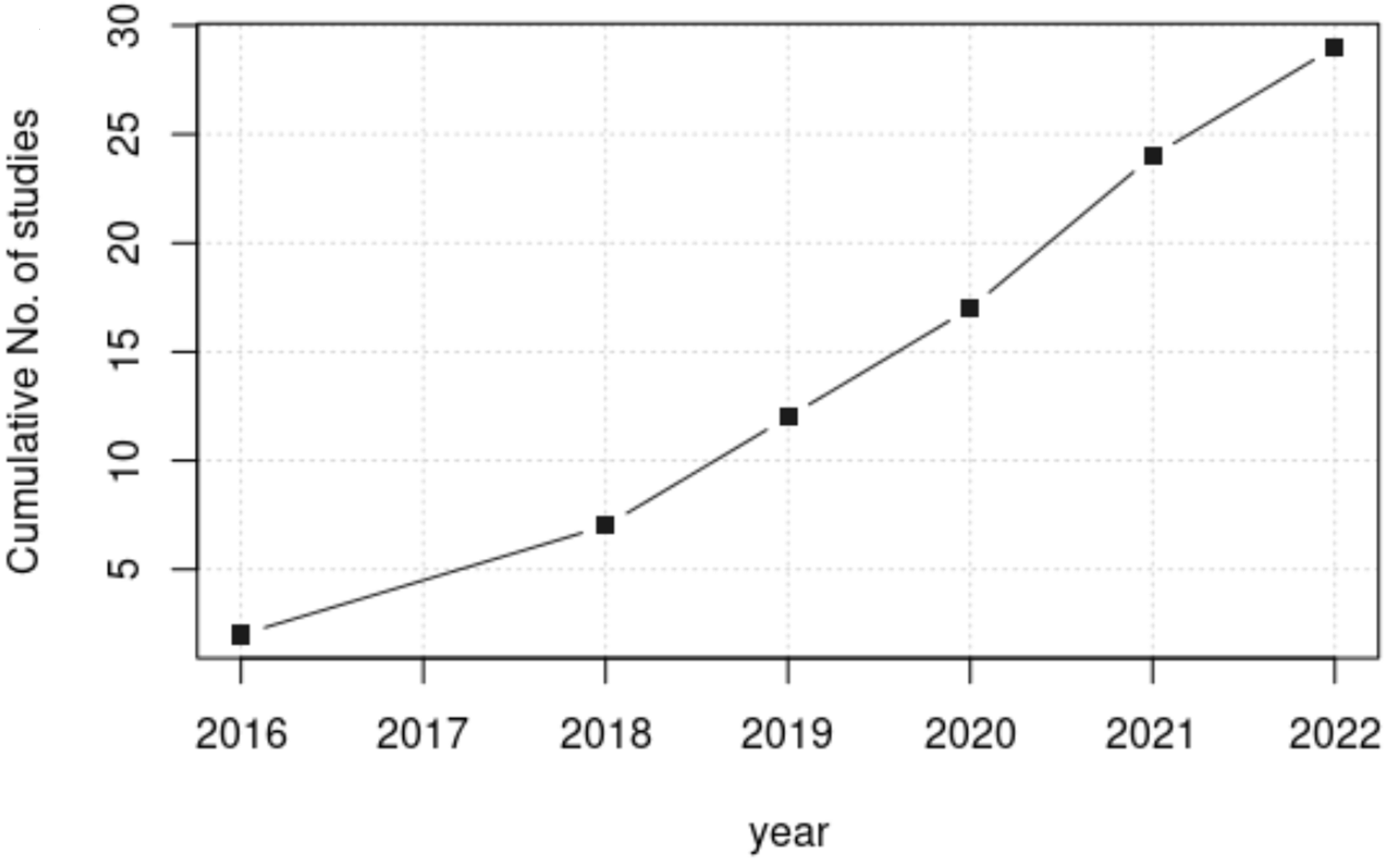 Fig. 6.Cumulative number of radiomics studies included in our study over years.