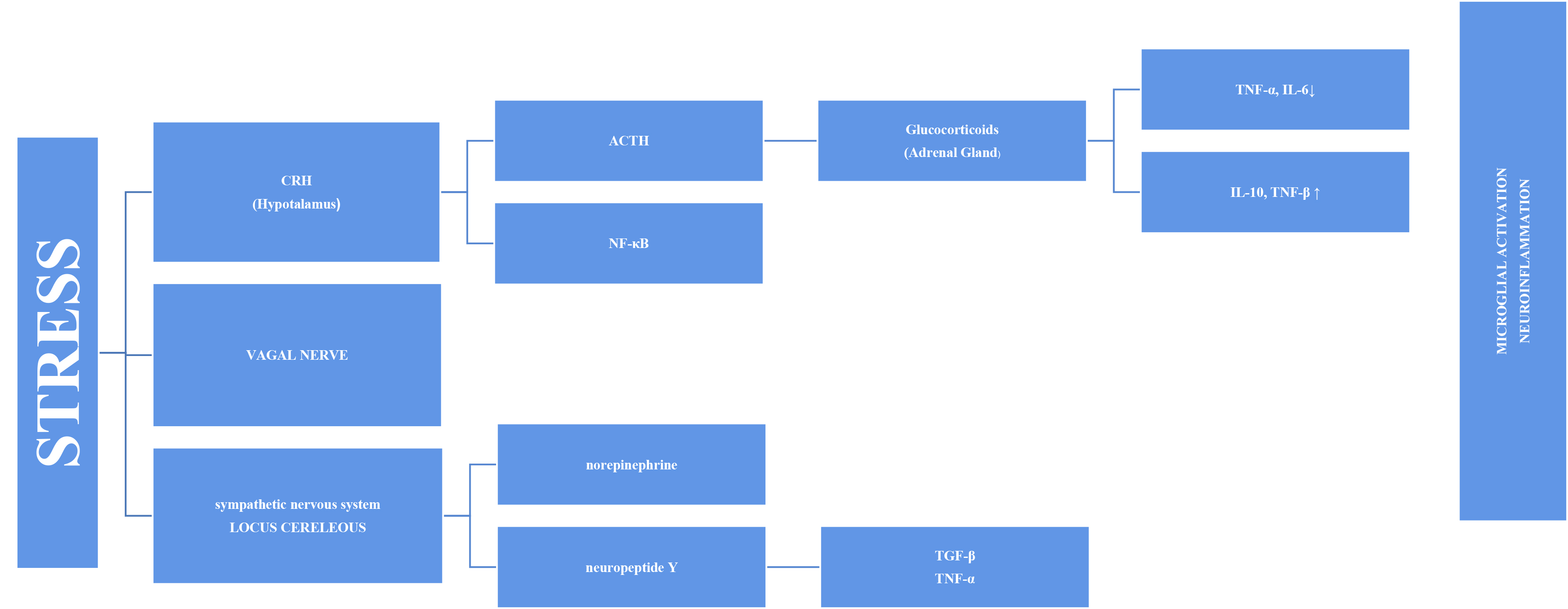 The stress response involves the sympathetic system as well as the HPA axis, in the axis of “nervous, endocrine and immune” mechanisms. The adrenal medulla secretes more norepinephrine (NE) and epinephrine (E) into the bloodstream as a result of the quick reaction brought on by S-Adenosil metiyonin (SAM) activation. Sympathetic nerves also secrete more NE, which raises NE levels in the brain [24]. The organism becomes more vigilant and responds quickly to environmental cues when NE is released. Chronic stress causes locus coeruleus (LC) neurons to become hyperactive, which may be a factor in stress-related depression disorders. Chronic stress may have a mediating effect on microglia through catecholamines. According to recent research, microglia probably take part in the neuroinflammatory response that results from stress, partly via noradrenergic transmission [25]. It has been proposed that NE can upregulate the transcription of the proinflammatory immune response genes interleukin-1 (IL-1), tumor necrosis factor (TNF), and interleukin-6 (IL-6) and decrease the transcription of antiviral type I interferon (IFN) genes [26, 27].