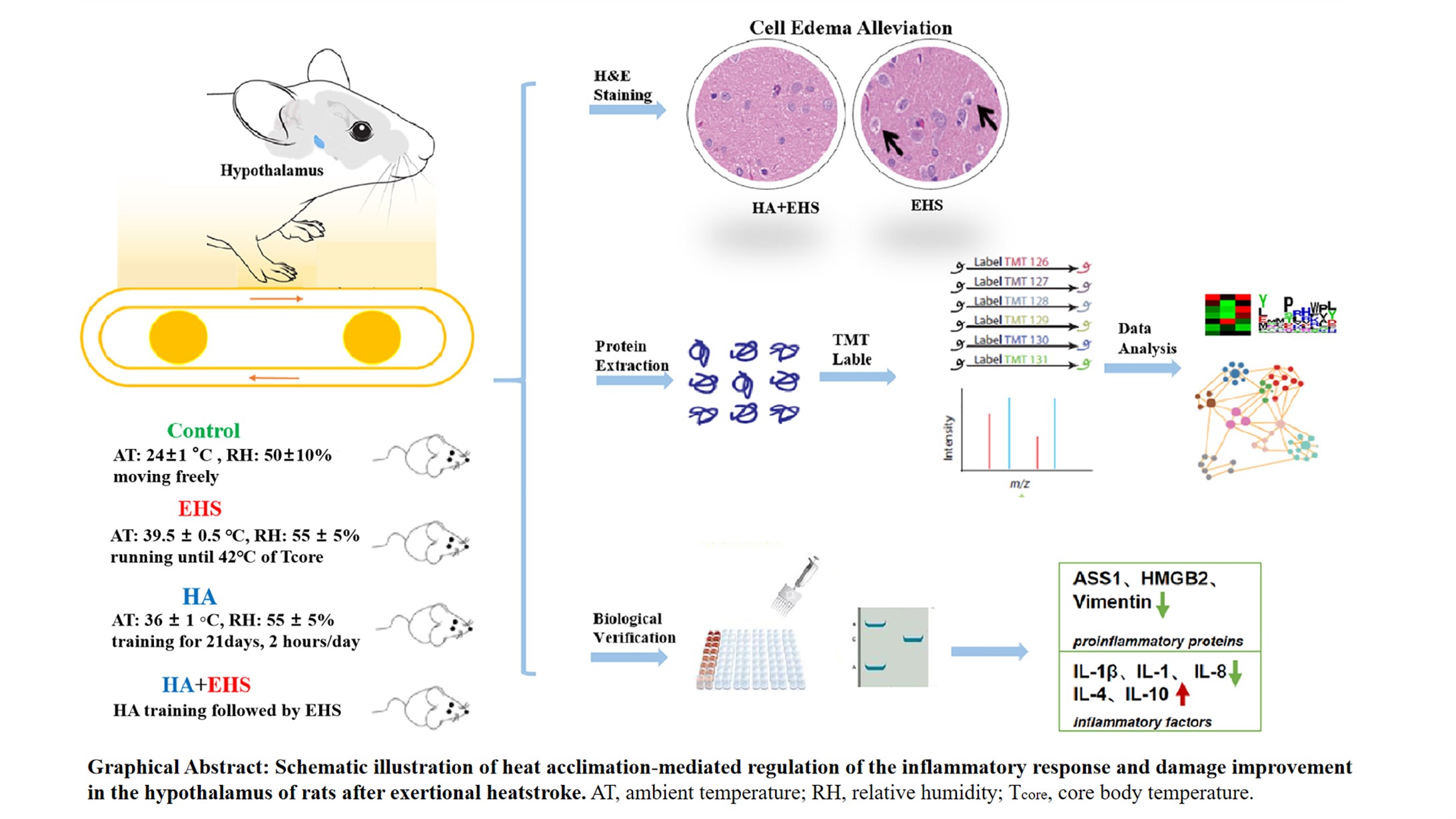 Thus, controlling inflammatory conditions could be a key strategy employed by HA to mitigate the hypothalamic dysfunction induced by EHS. ASS1, HMGB2 and VIM may be candidate proteins involved in the mechanism underlying the protective effect of HA against hypothalamic injury after EHS.