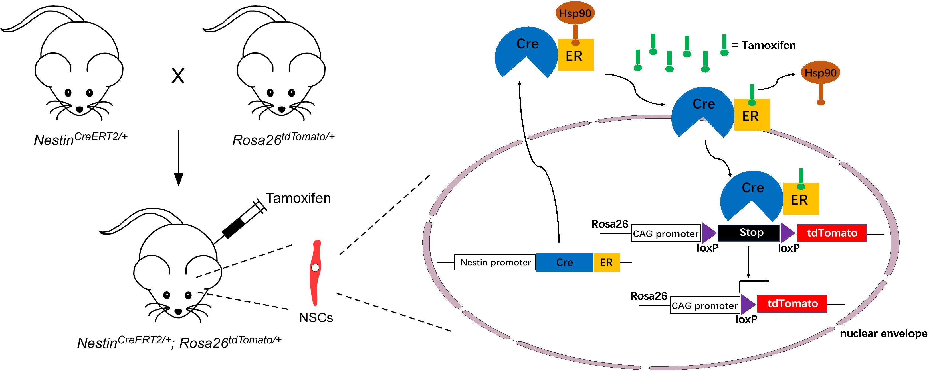 Nestin-CreERT2 mice with Rosa26-CAG-tdTomato mice. Upon the
