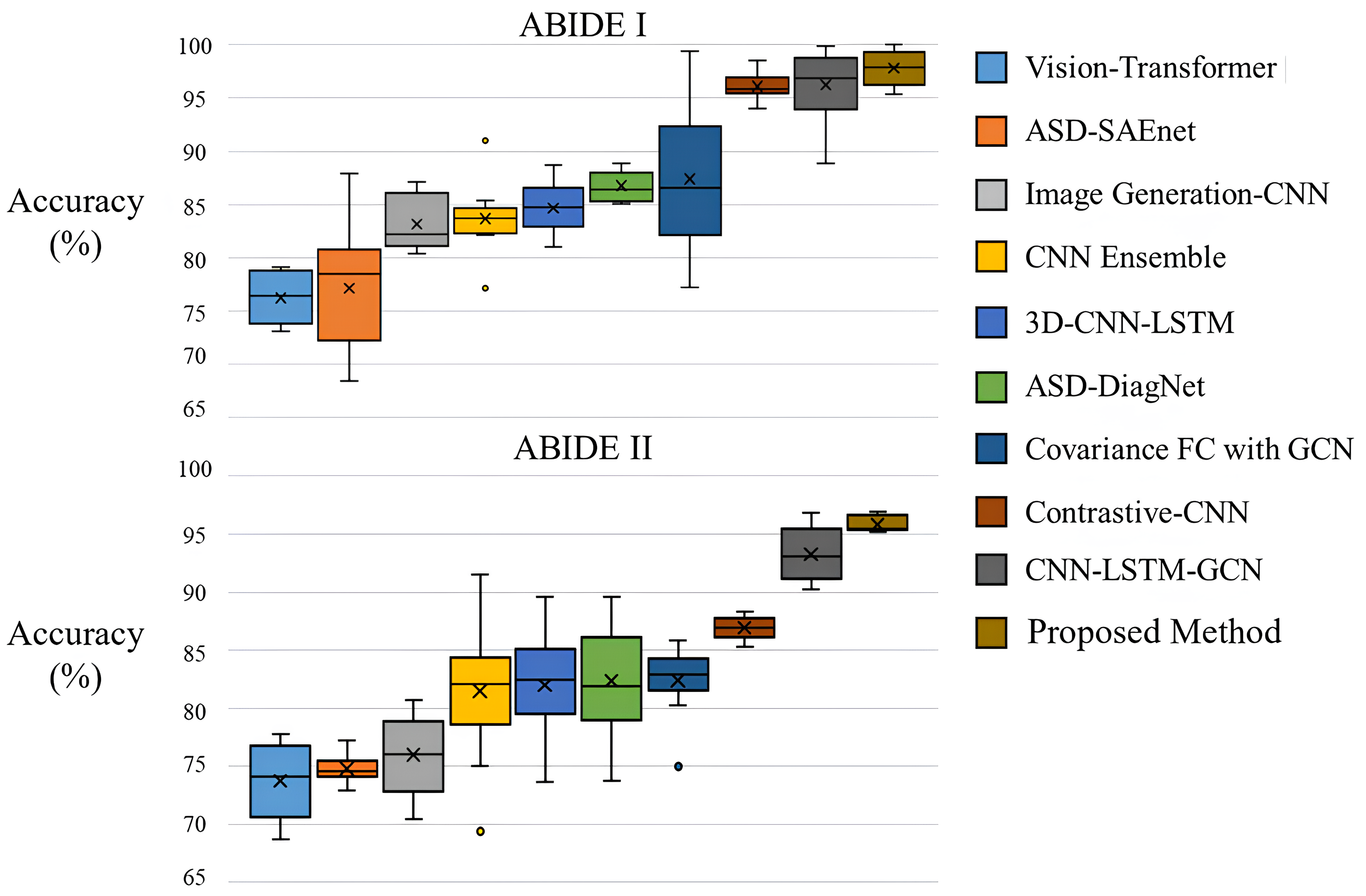 Fig. 2.Box plot of accuracy on the ABIDE I and II datasets. ABIDE, autism brainimaging data exchange.