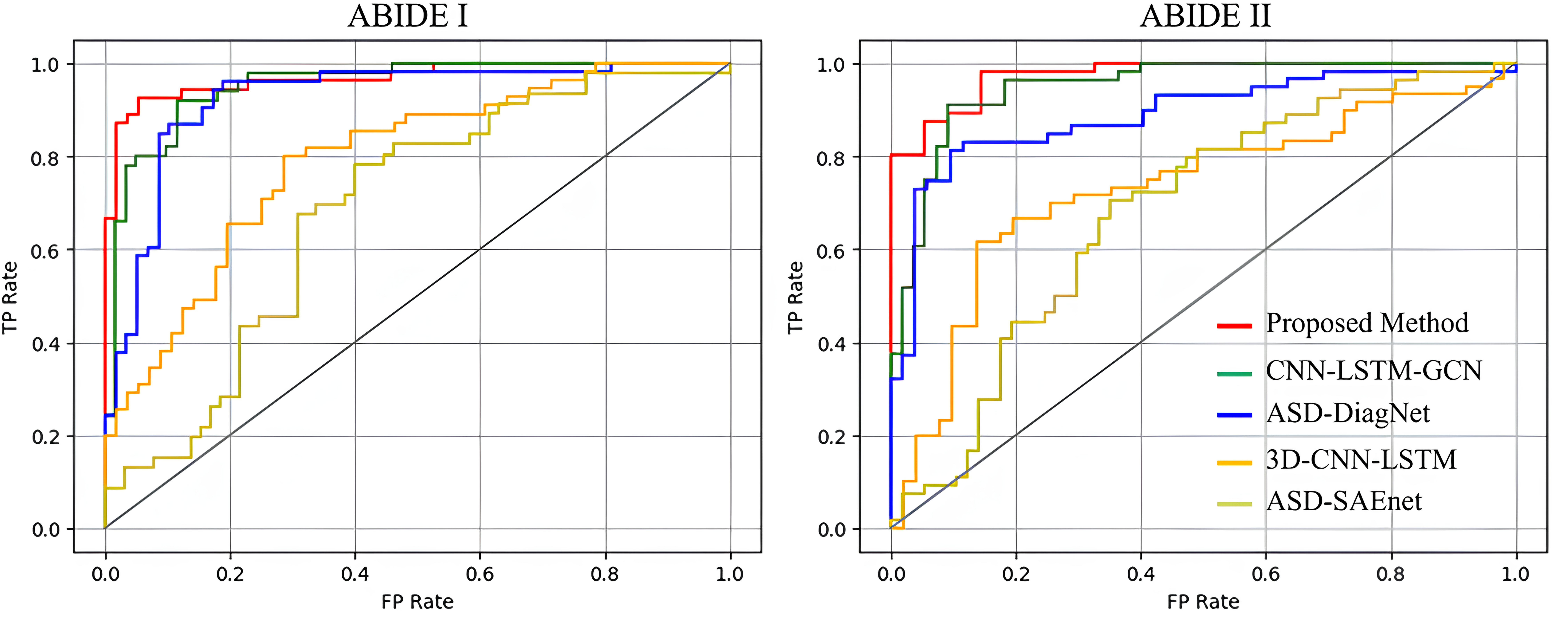 Fig. 3.ROC curves on the ABIDE I and II datasets. ROC, receiver operating characteristic; FP, False Positive; TP, True Positive.