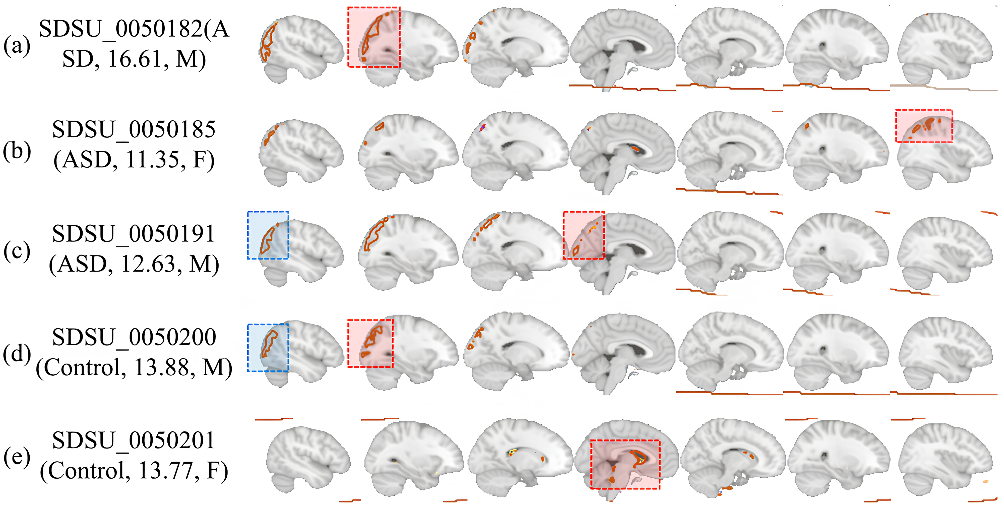 Fig. 4.Brain ROI activations depend on the presence or absence of disease, age, and sex. (a–c) represent brain scans of patients with ASD, while (d,e) depict brain scans of controls. The blue boxes denote common features visible in both individuals with the disease and those without it, while the red boxes indicate the level of activation varying according to age, gender, and disease status of each patient and control. ROI, represent regions of interest; M, male; F, female.