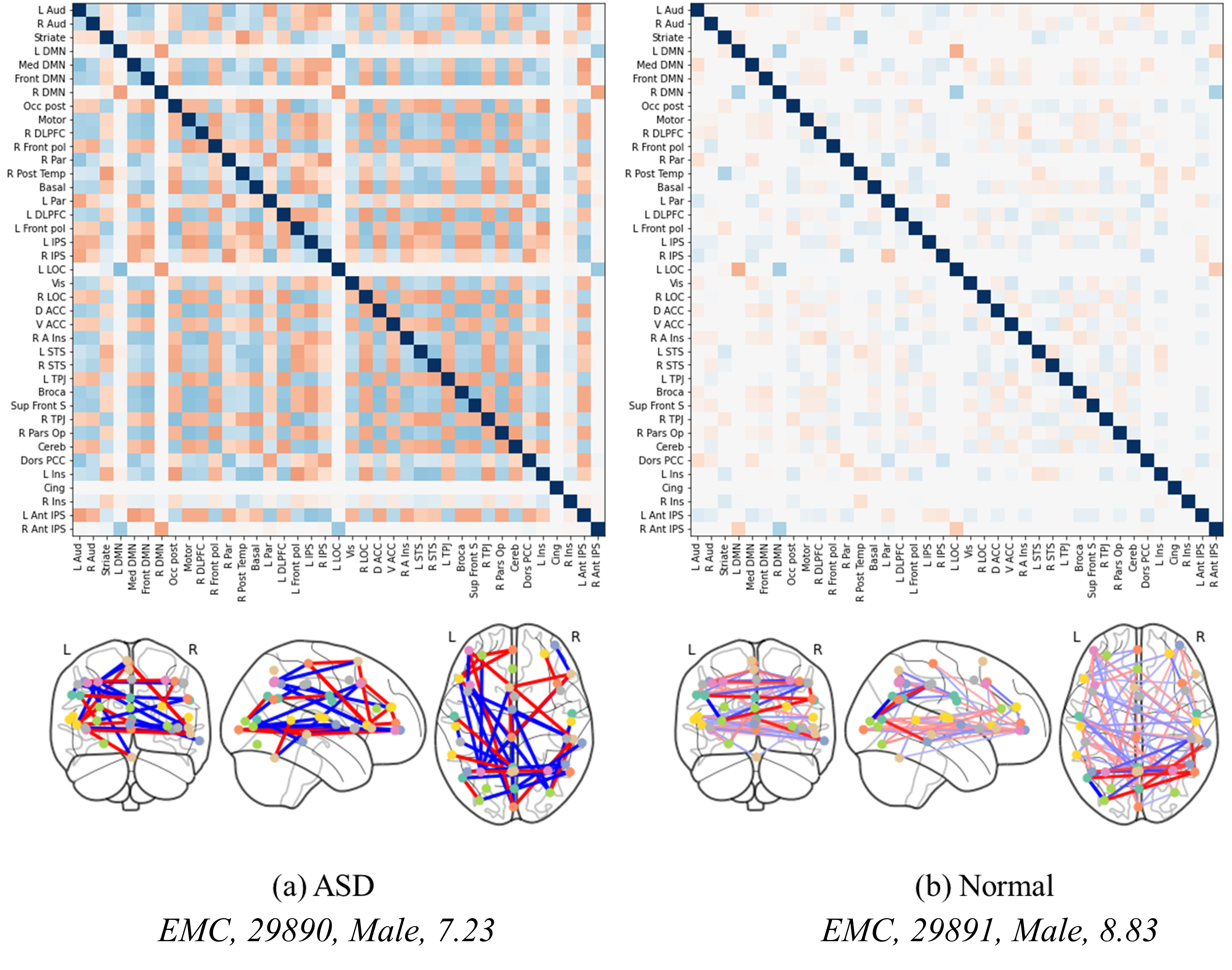 Fig. 5.Correlation matrices and brain regional connectivity graphs in ASD and normal brains. (a,b) show the level of brain activation between normal individuals and patients of similar age groups.