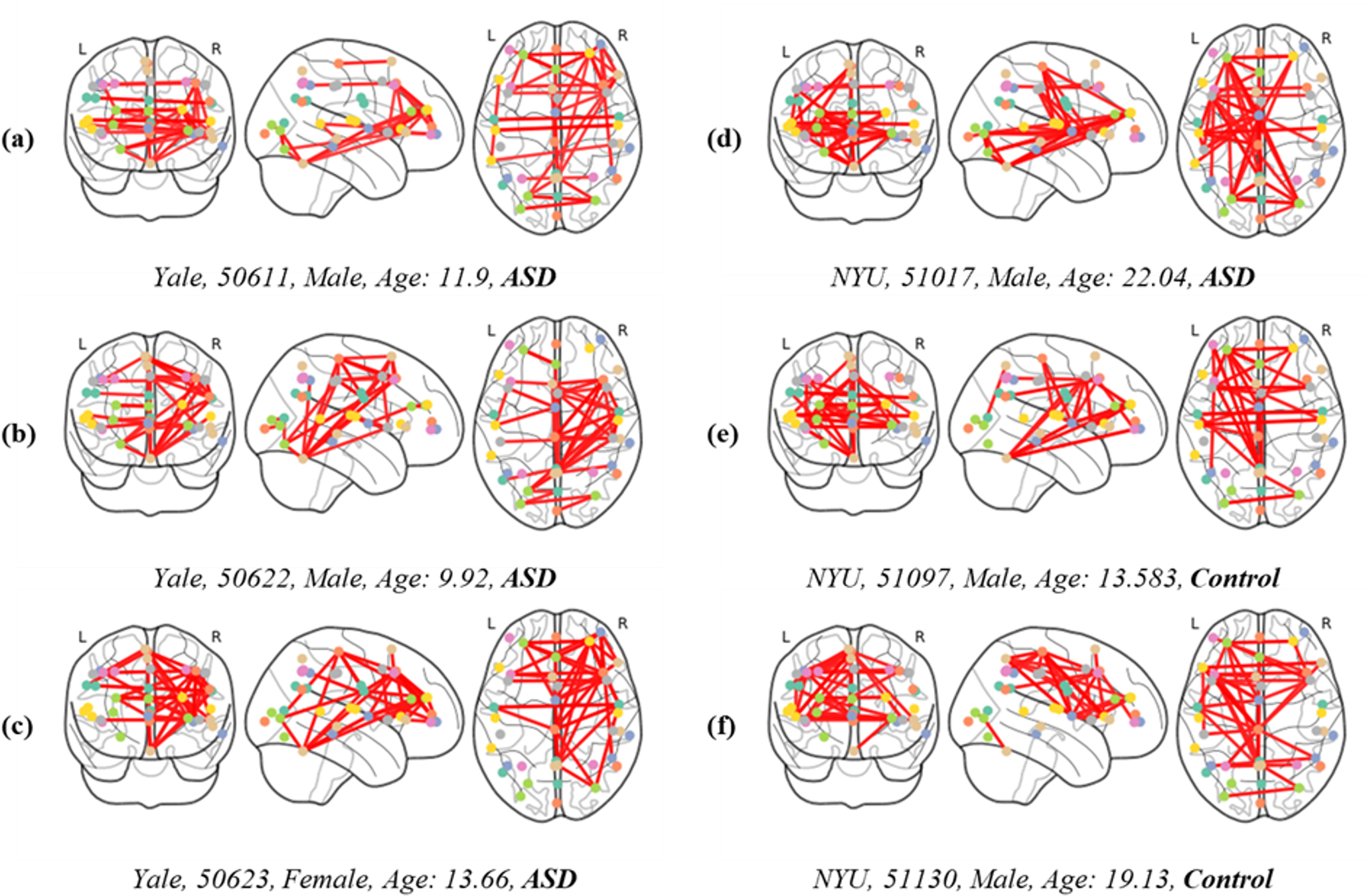 Fig. 6 depicts FC overlaid on brain images to analyze differences based on the presence of disease, as well as sex and age. Below each image, details such as the collection site, subject ID, sex, age, and disease status are documented. This allows for a detailed examination of patterns in ASD across different age groups, as observed in the differences between images Fig. 6a,b. This not only suggests that FC characteristics in ASD can vary with age and between individuals but also highlights the importance of deep learning models in capturing these individual variations. Furthermore, a comparison between images Fig. 6a,c demonstrates sex-based variations in brain characteristics. For instance, the posterior region of the left hemisphere is almost inactive in image Fig. 6c compared with Fig. 6a, highlighting the diversity in brain activation patterns in ASD. The differences among images Fig. 6a–d, where no similar patterns are observed, underscore the necessity of the proposed model. Additionally, the similarities observed in images Fig. 6d–f, regardless of the presence or absence of disease, present a unique challenge. Considering that d represents ASD while Fig. 6e,f are from healthy brains, distinguishing these subtle differences becomes a primary function of the model. Therefore, the effectiveness of our proposed method, which employs enhanced FC with multi-head attention and an edge label-based GNN, is validated by its superior performance.