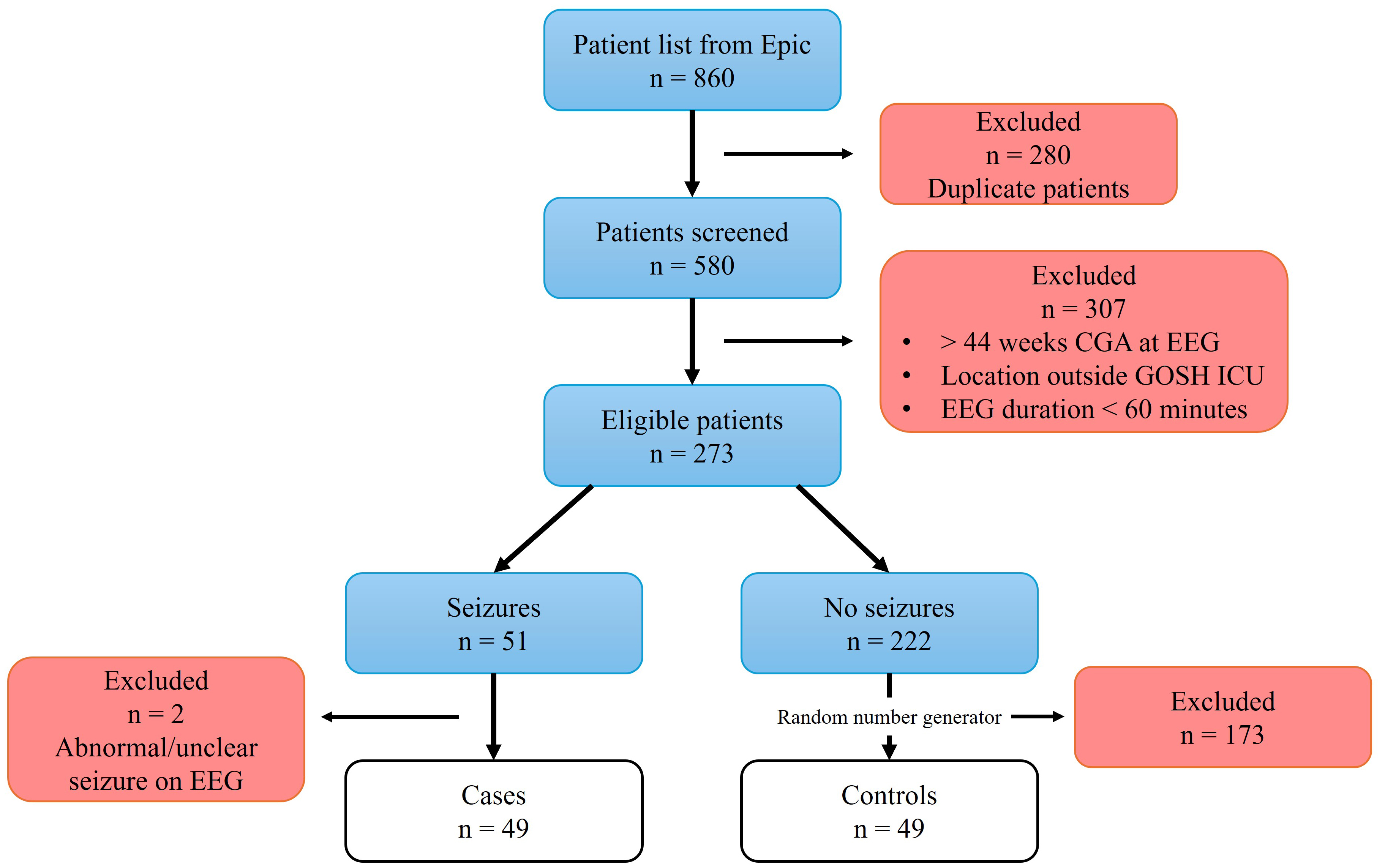 A search of the electronic patient record (Epic) produced a list of 580 individual EEG patients who were screened for eligibility. In total, 273 patients met inclusion criteria: 51 of these with seizures, 222 without seizures. The prevalence of seizures (within the population of patients eligible for the study) was approximately 19%. Subsequently, two neonates were excluded from the cases group due to lack of clear consensus on the diagnosis in the neurophysiology report. This provided 49 cases for the study and a random number generator was used to select 49 controls (see Fig. 1).