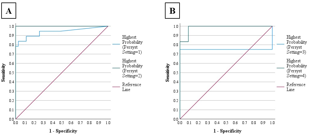 ROC curve of seizure probability subdivided by Persyst settings. (A) Study recordings using Persyst setting 1 (light blue) and setting 2 (dark blue line). (B) Study recordings using Persyst setting 3 (light blue) and setting 4 (dark blue line).