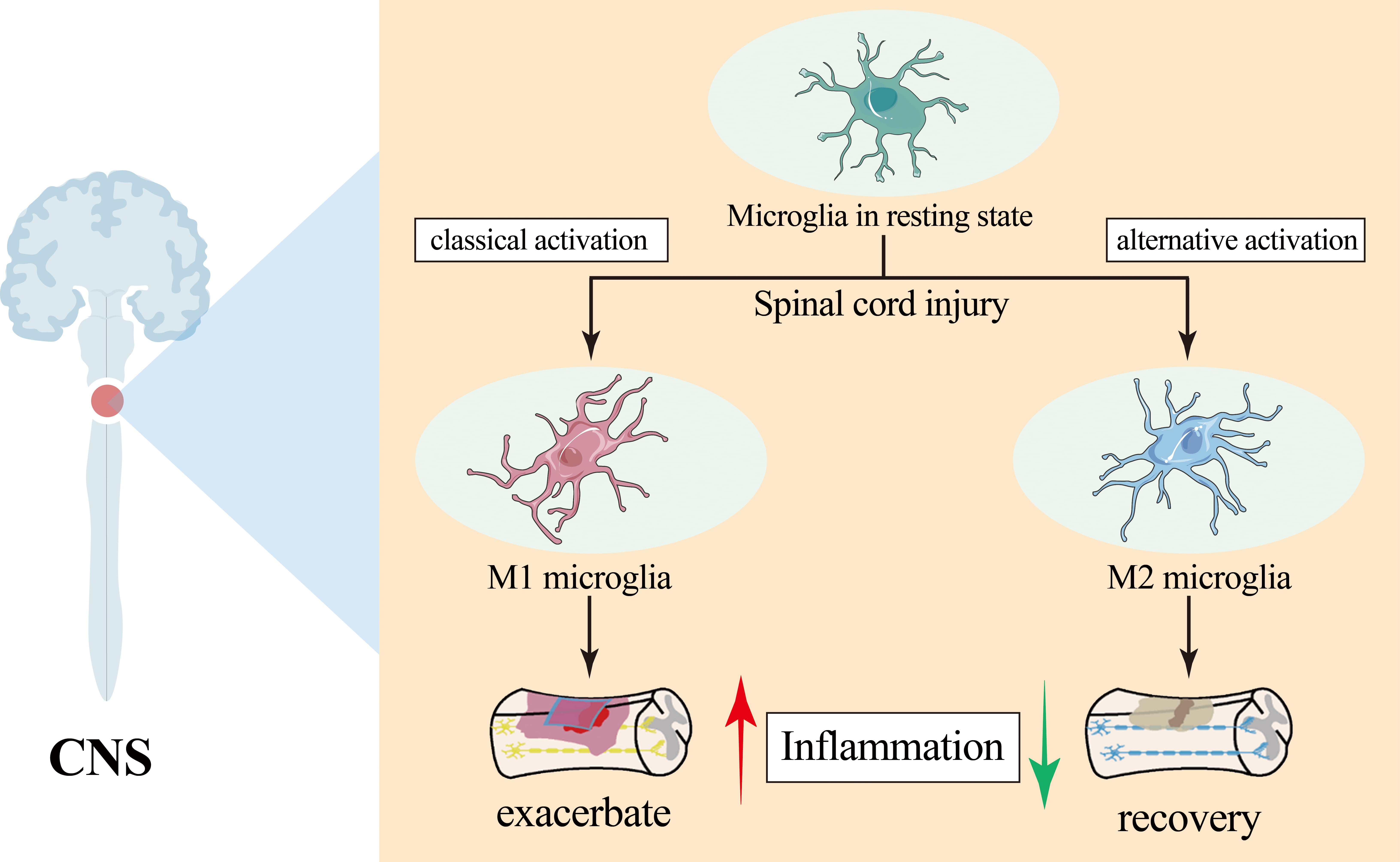 Polarization and effects of microglia after spinal cord injury. Microglia polarization phenotypes are mainly classified into classical activation (M1) and alternative activation (M2). M1 microglia exacerbate neuroinflammation and the M2 microglia suppresses inflammation. CNS, central nervous system.