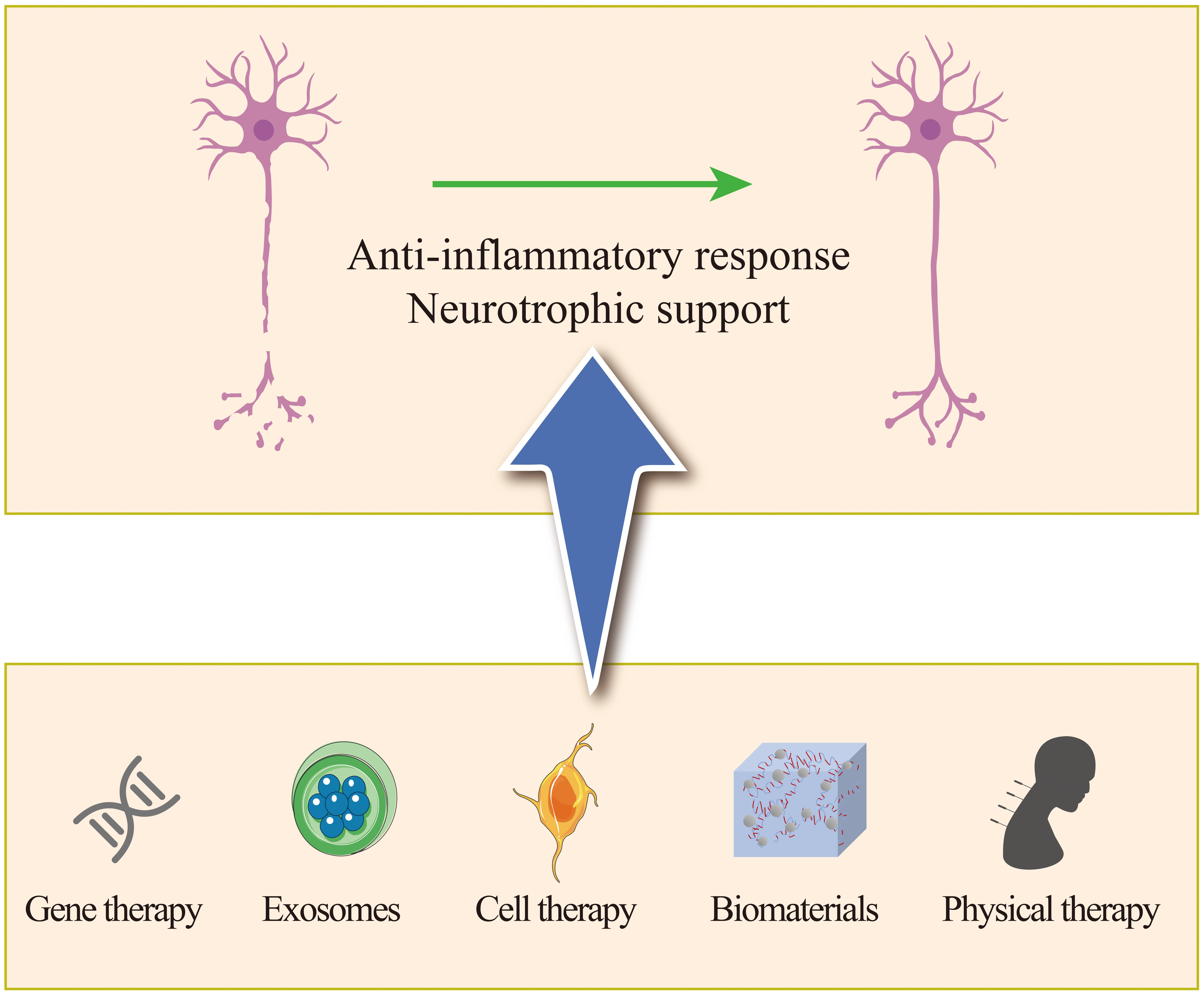Introduce the current methods for treating spinal cord injury. The methods for treating spinal cord injury are mainly divided into 5 categories, including gene therapy, exosomes, cell therapy, biomaterials, and physical therapy, all of which can inhibit inflammatory reactions and provide neuroprotective effects.