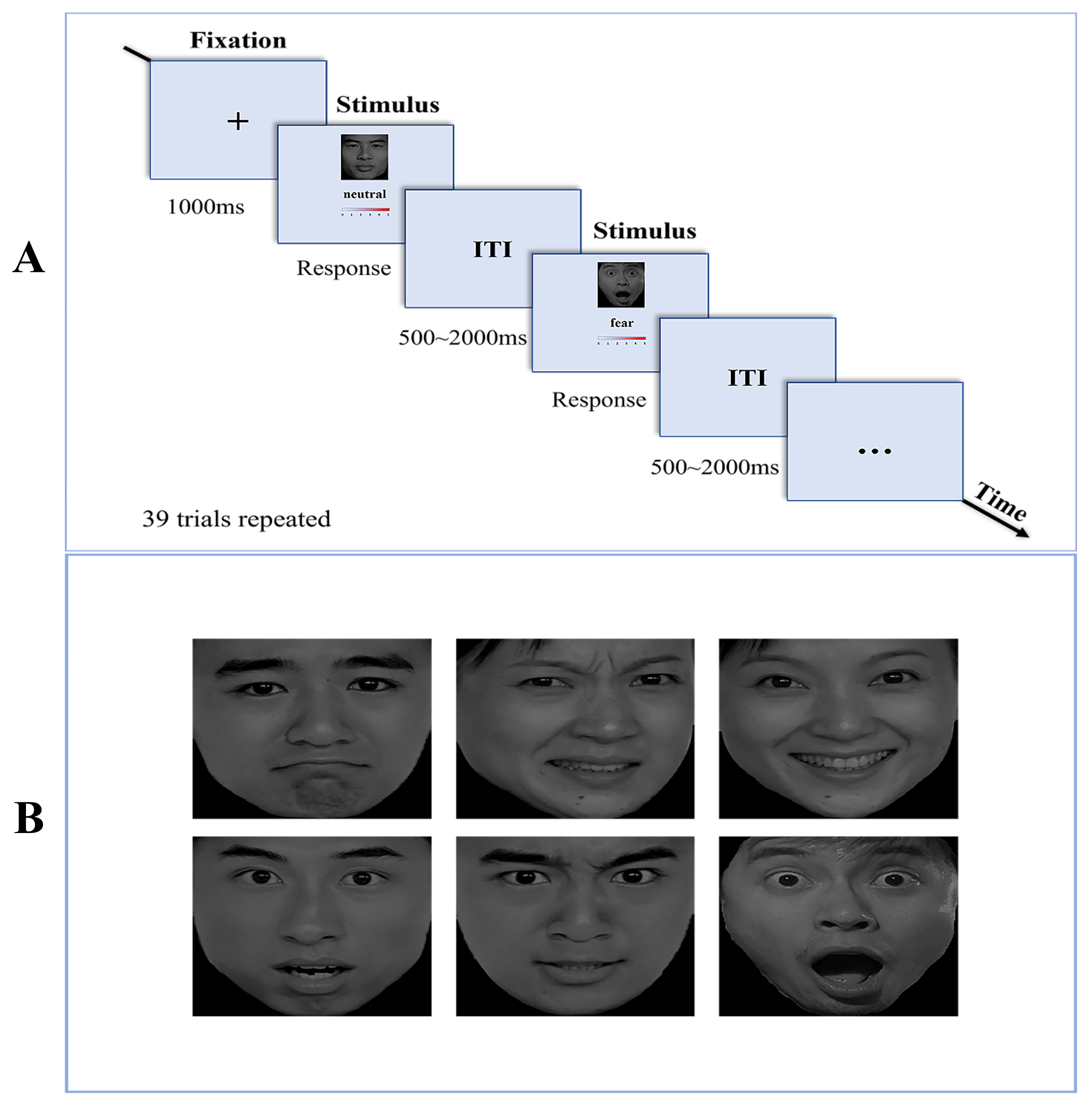 Fig. 1. Procedure of the EIRT Task. (A) Illustration of the EIRT task, there were six blocks with different target stimuli and each block contained 39 trials. (B) The emotional facial stimuli employed in the EIRT task. Top row: sad, disgusted, happy faces. Base row: surprise, anger, fear faces. This figure was drawn using Adobe Photoshop 2024 (Adobe Systems lnc., San Jose, CA, USA.). Abbreviations: EIRT, Emotion Intensity Recognition Task; ITI, inter-trial interval.