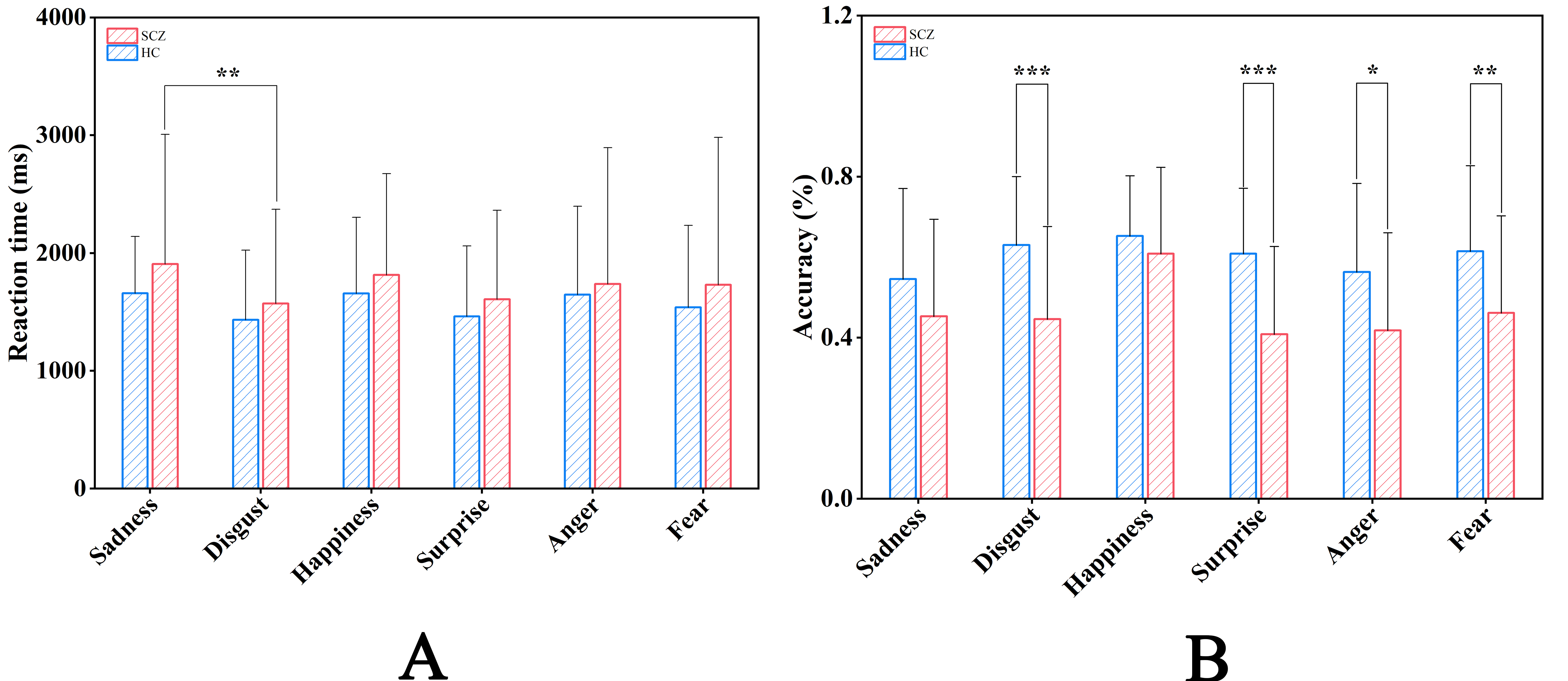 Fig. 2. Comparisons of Behavioral Data. Reaction Time (A) and Accuracy (B) in the different emotional faces for Schizophrenia group and Healthy control group. Notes: *p