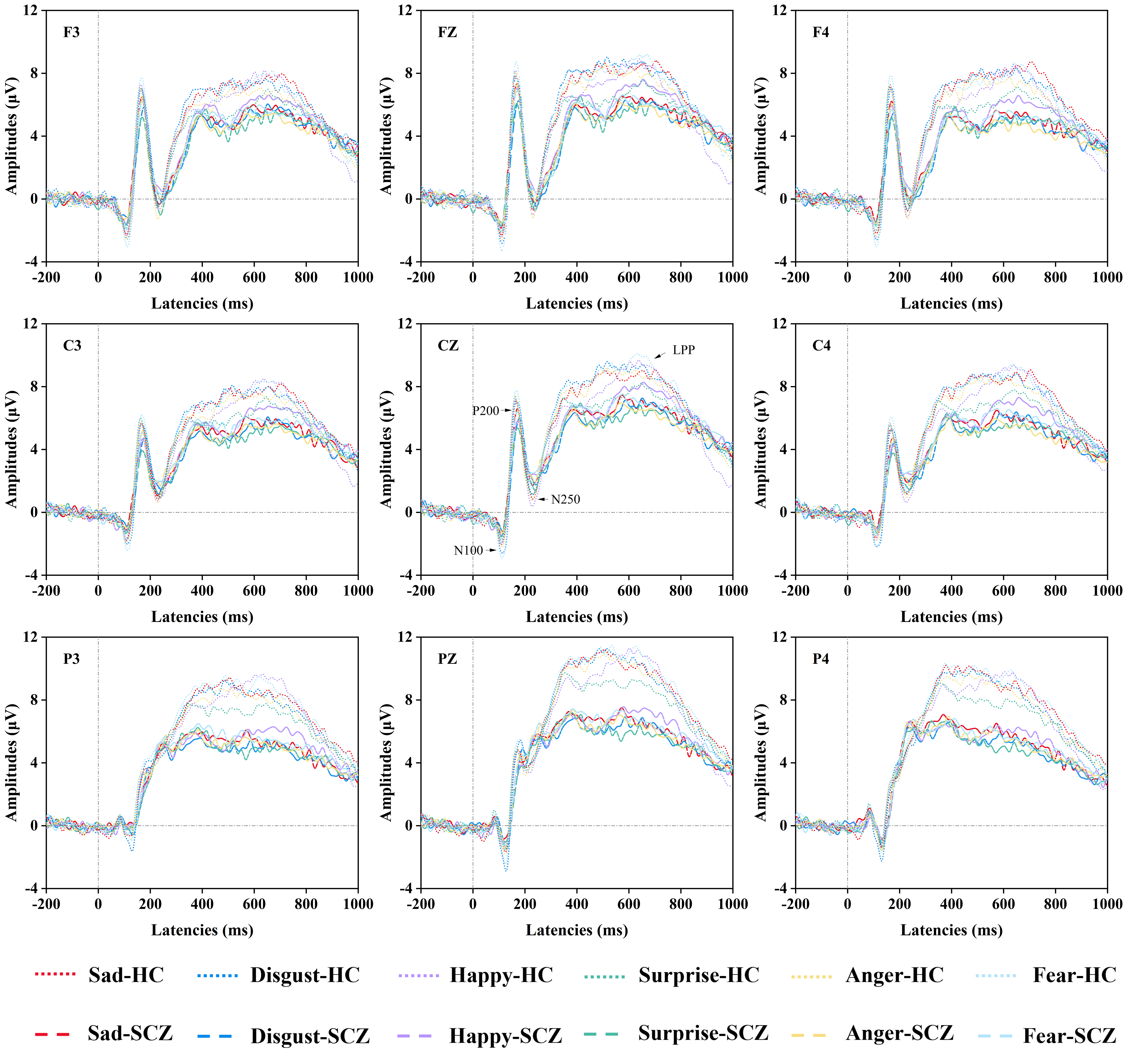 Fig. 3. Comparisons of ERP Data. The grand averaged ERP (N100, P200, N250, LPP) waveforms for selected electrodes (F3, Fz, F4, C3, Cz, C4, P3, Pz, P4) in the schizophrenia group and the healthy control group under different emotional faces (sad faces, disgust faces, happy faces, surprise faces, anger faces, fear faces). Abbreviations: SCZ, schizophrenia; HC, healthy control; LPP, late positive potential; ERP, event-related potential.