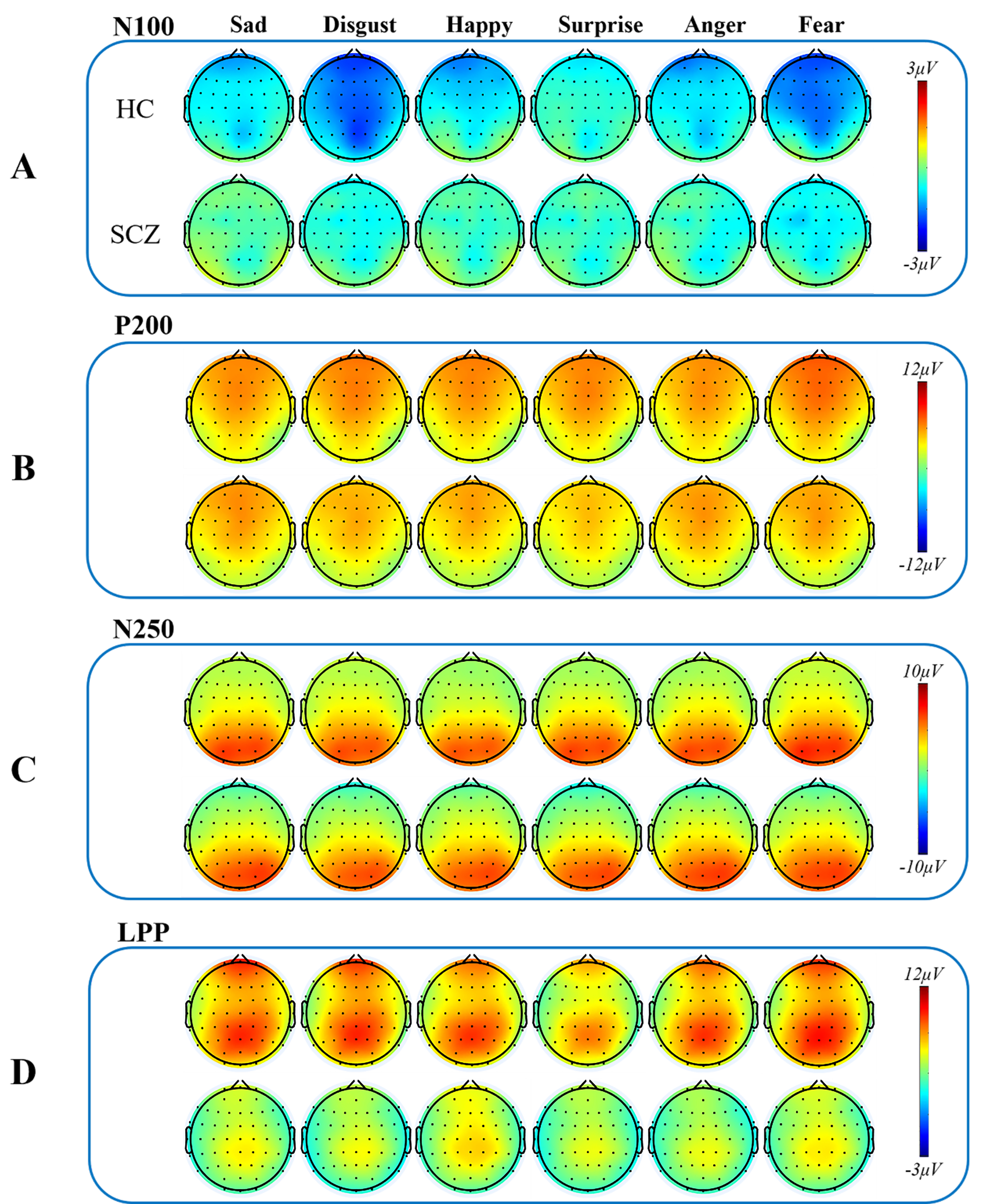 Fig. 4. Topographic maps of ERP components. Topographic maps of four ERP components (N100, P200, N250, LPP) in different emotional faces (sad faces, disgust faces, happy faces, surprise faces, anger faces, and fear faces) in the schizophrenia group and the healthy control group. (A) Topographical distribution of grand averaged N100 within a time window of 100–140 ms post-stimuli under different emotional faces. (B) Topographical distribution of grand averaged P200 within a time window of 150–200 ms post-stimuli under different emotional faces. (C) Topographical distribution of grand averaged N250 within a time window of 210–300 ms post-stimuli under different emotional faces. (D) Topographical distribution of grand averaged LPP within a time window of 400–800 ms post-stimuli under different emotional faces. Abbreviations: SCZ, schizophrenia; HC, healthy control; LPP, late positive potential, ERP, event-related potential.