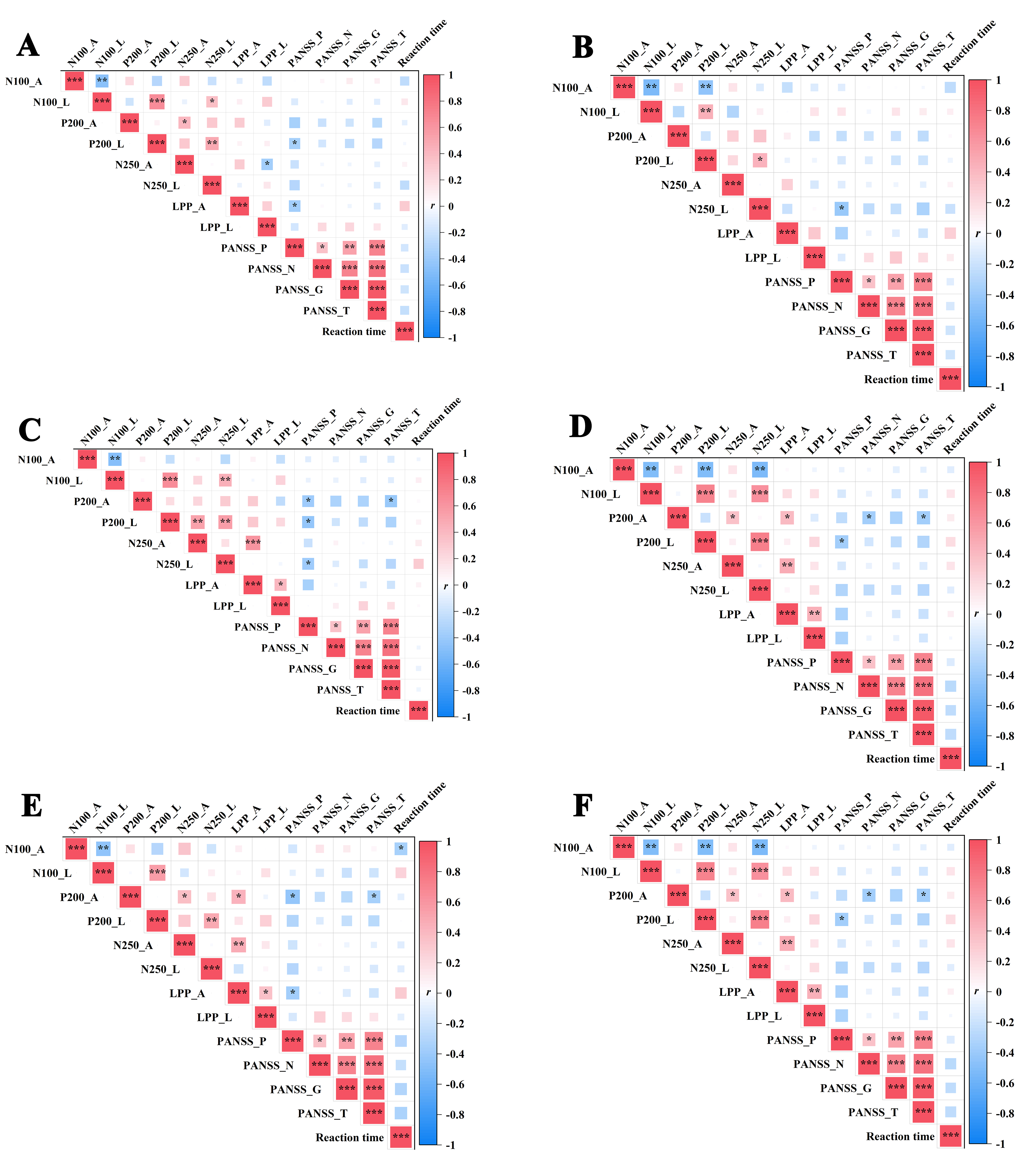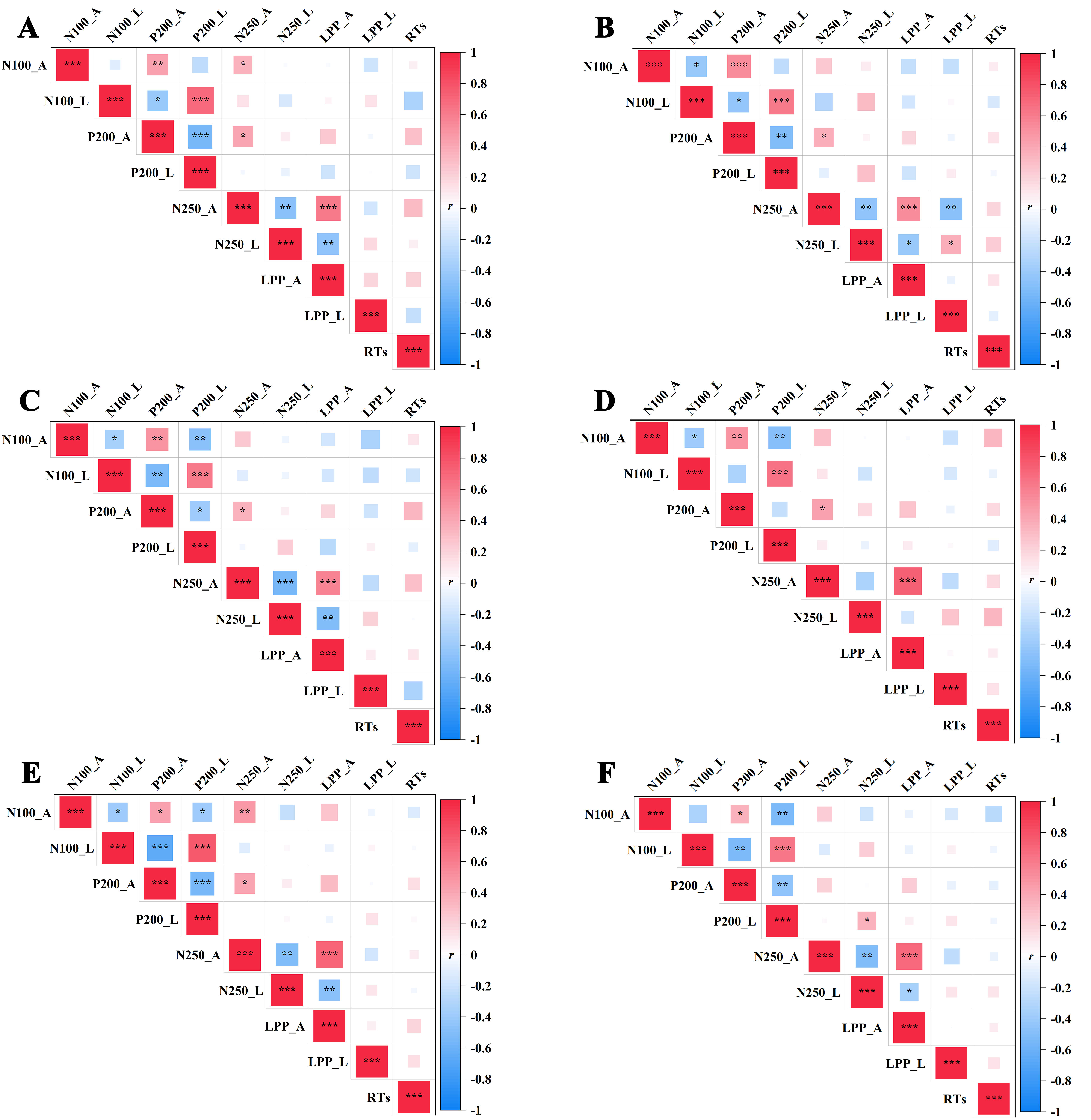 Fig. 5. The correlation analysis of ERP (N100, P200, N250, LPP) components’ latency and mean amplitude, reaction times and scale scores in different emotional faces. (A) Sad faces, (B) disgust faces, (C) happy faces, (D) surprise faces, (E) anger faces and (F) fear faces. Notes: *p