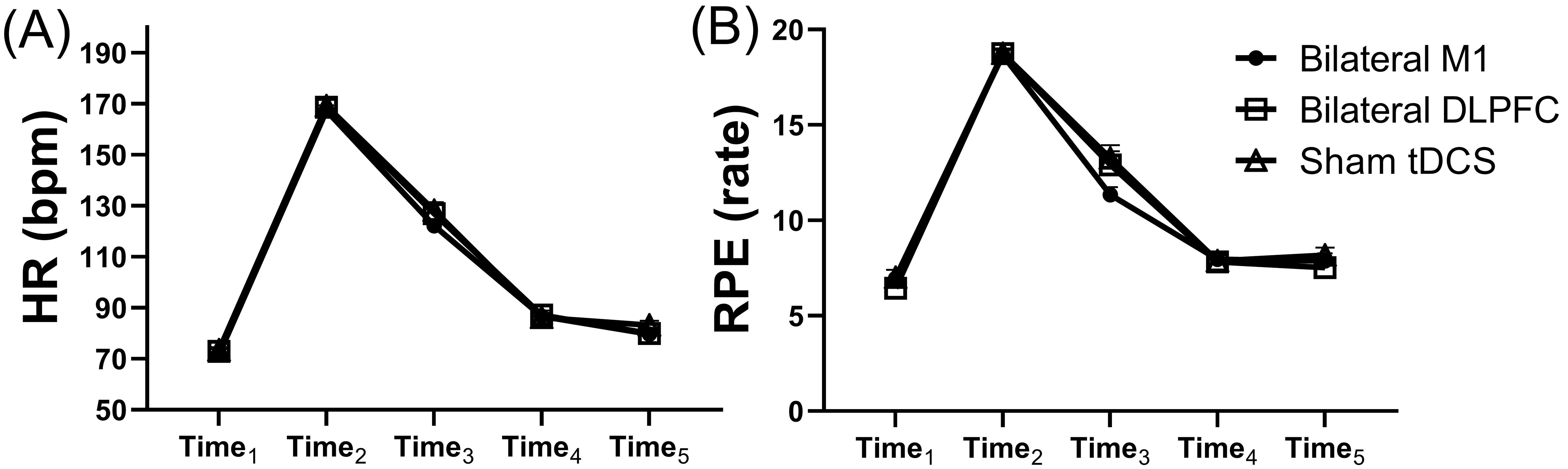 Fig. 2. The results of the psycho-physiological measures. HR (A) and RPE (B) during the experimental procedures (Time1: rest; Time2: exhaustion; Time3: before tDCS; Time4: after tDCS, before cognitive performance; Time5: cognitive tasks). M1, primary motor cortex; DLPFC, dorsolateral prefrontal cortex; HR, heart rate; RPE, rating of perceived exertion; tDCS, transcranial direct current stimulation. Error bars represent standard error (SEM).