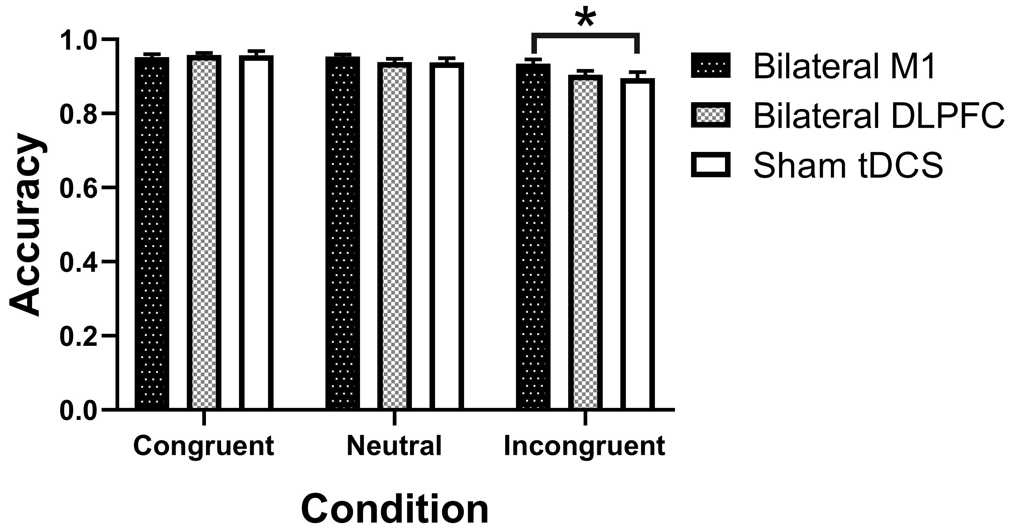 Fig. 3. Outcomes from various intervention sessions on Stroop task accuracy. M1, primary motor cortex; DLPFC, dorsolateral prefrontal cortex; tDCS, transcranial direct current stimulation. * Statistically significant at p