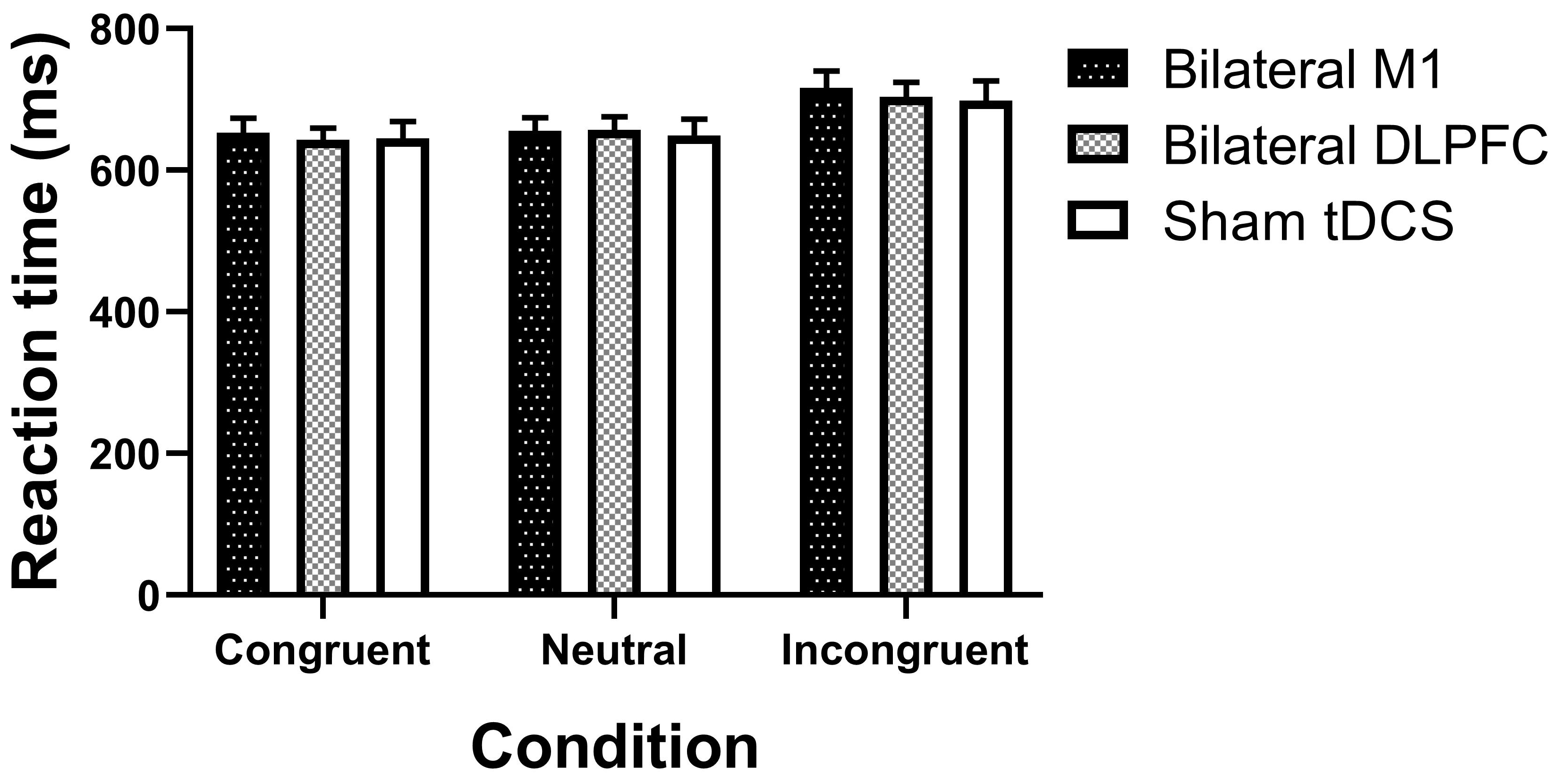 Fig. 4. Outcomes from various intervention sessions on reaction time in the Stroop task. M1, primary motor cortex; DLPFC, dorsolateral prefrontal cortex; tDCS, transcranial direct current stimulation. Error bars indicate the standard error of the mean (SEM).