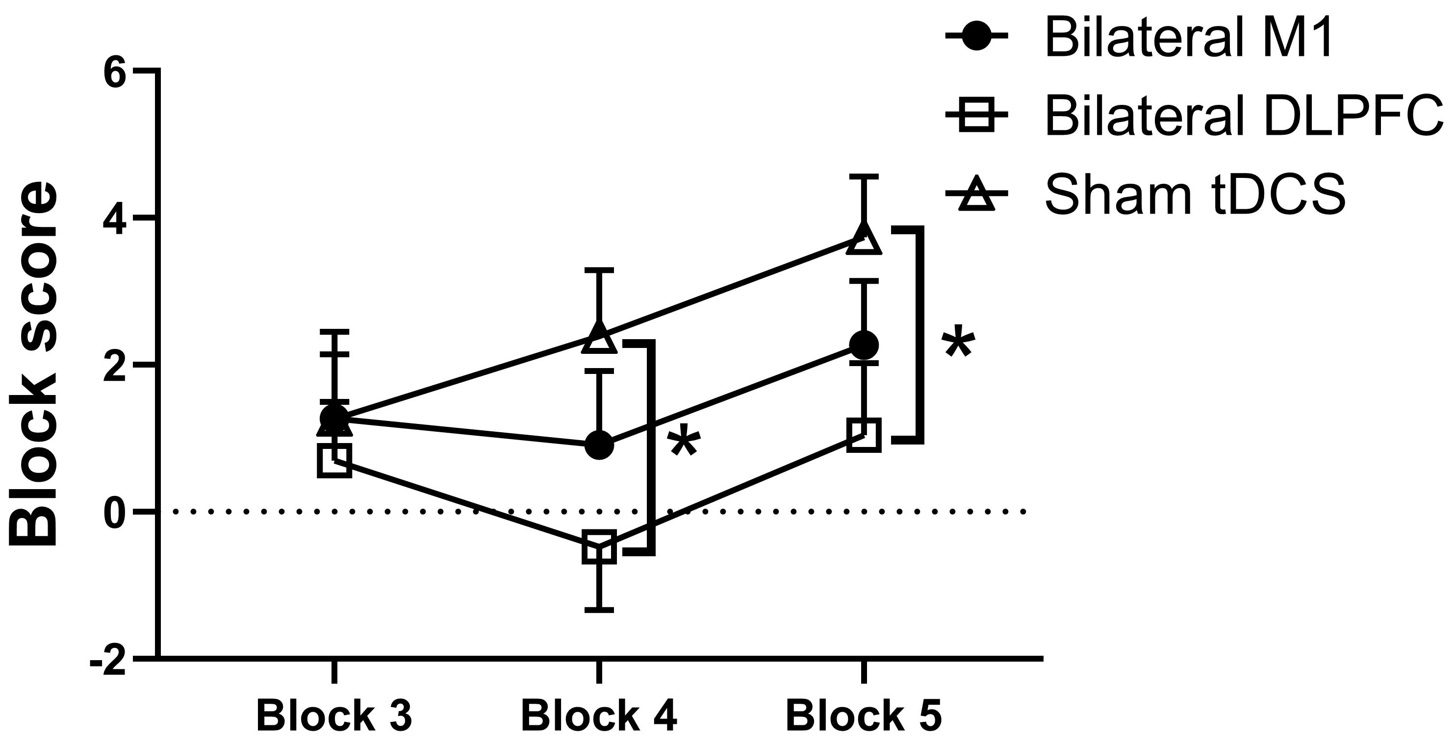 We found a significant improvement in Stroop task accuracy following dual-site anodal tDCS over the M1 compared with the sham intervention in the incongruent condition (p = 0.036). Net scores in the Iowa Gambling task during blocks 4 (p = 0.019) and 5 (p = 0.014) significantly decreased under dual-site tDCS targeting the DLPFC compared with the sham intervention. No differences in 2-back task performance were observed between sessions (all p > 0.05).