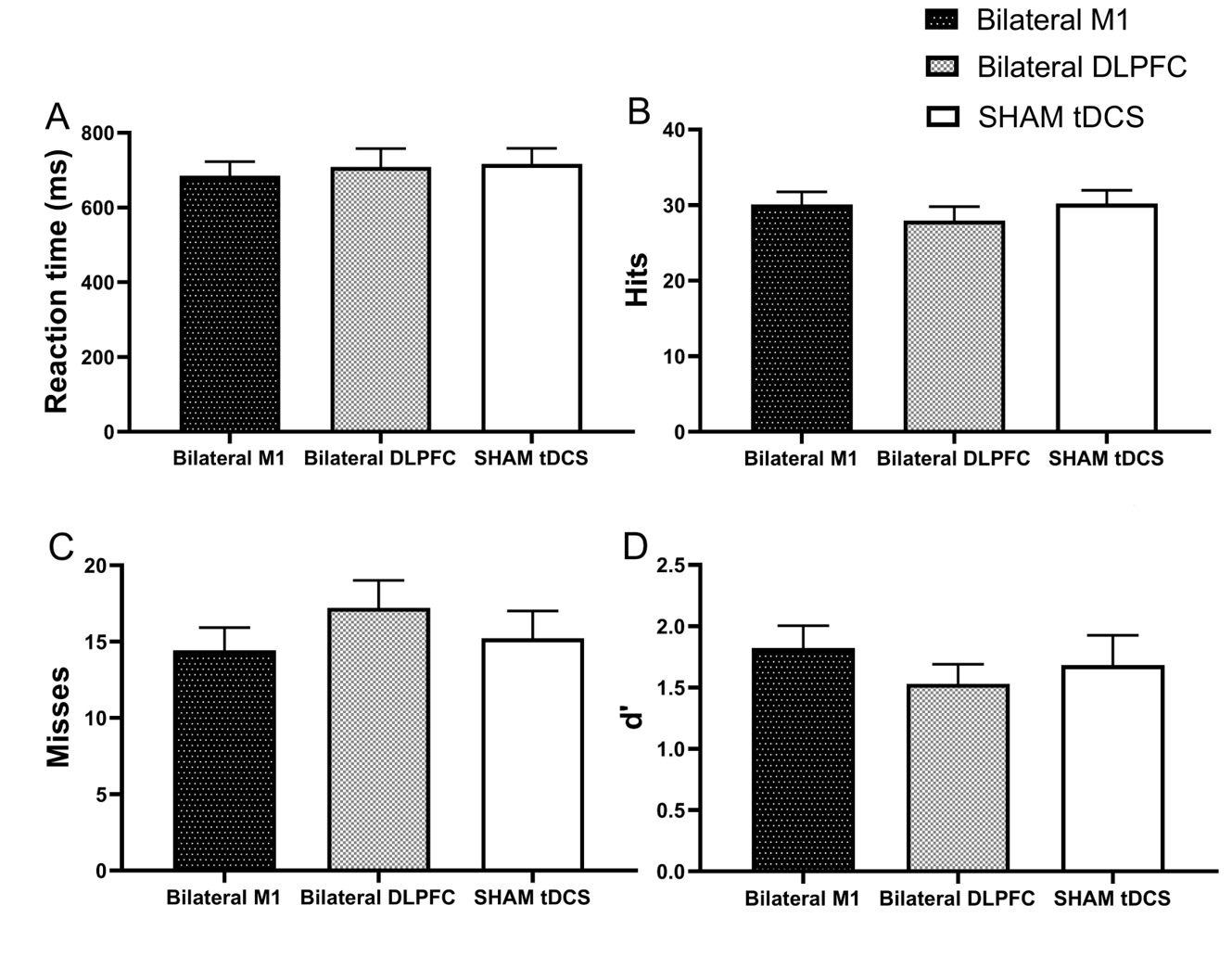 Fig. 6. Outcomes from various intervention sessions for reaction time (A), hits (B), misses (C), and index d’ (D) in the 2-back task. M1, primary motor cortex; DLPFC, dorsolateral prefrontal cortex; tDCS, transcranial direct current stimulation. Error bars indicate the standard error of the mean (SEM).