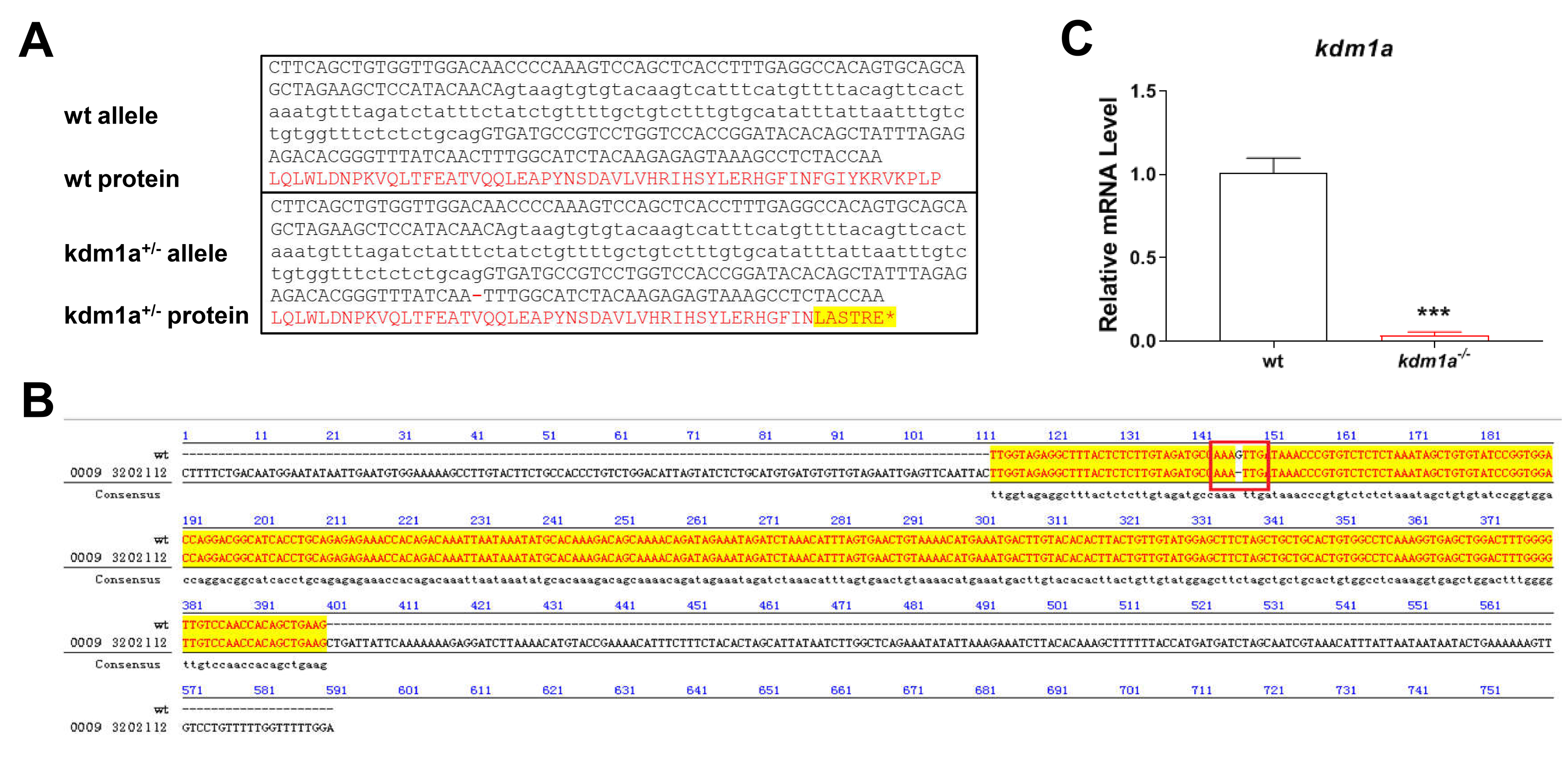 In this study, kdm1a deficient zebrafish were constructed using (clustered regularly interspaced short palindromic repeat) Clustered Regularly Interspaced Short Palindromic Repeats/CRISPRassociated protein 9 (CRISPR/Cas9) and the neurodevelopment was systematically assessed by a series of behavioral tests.