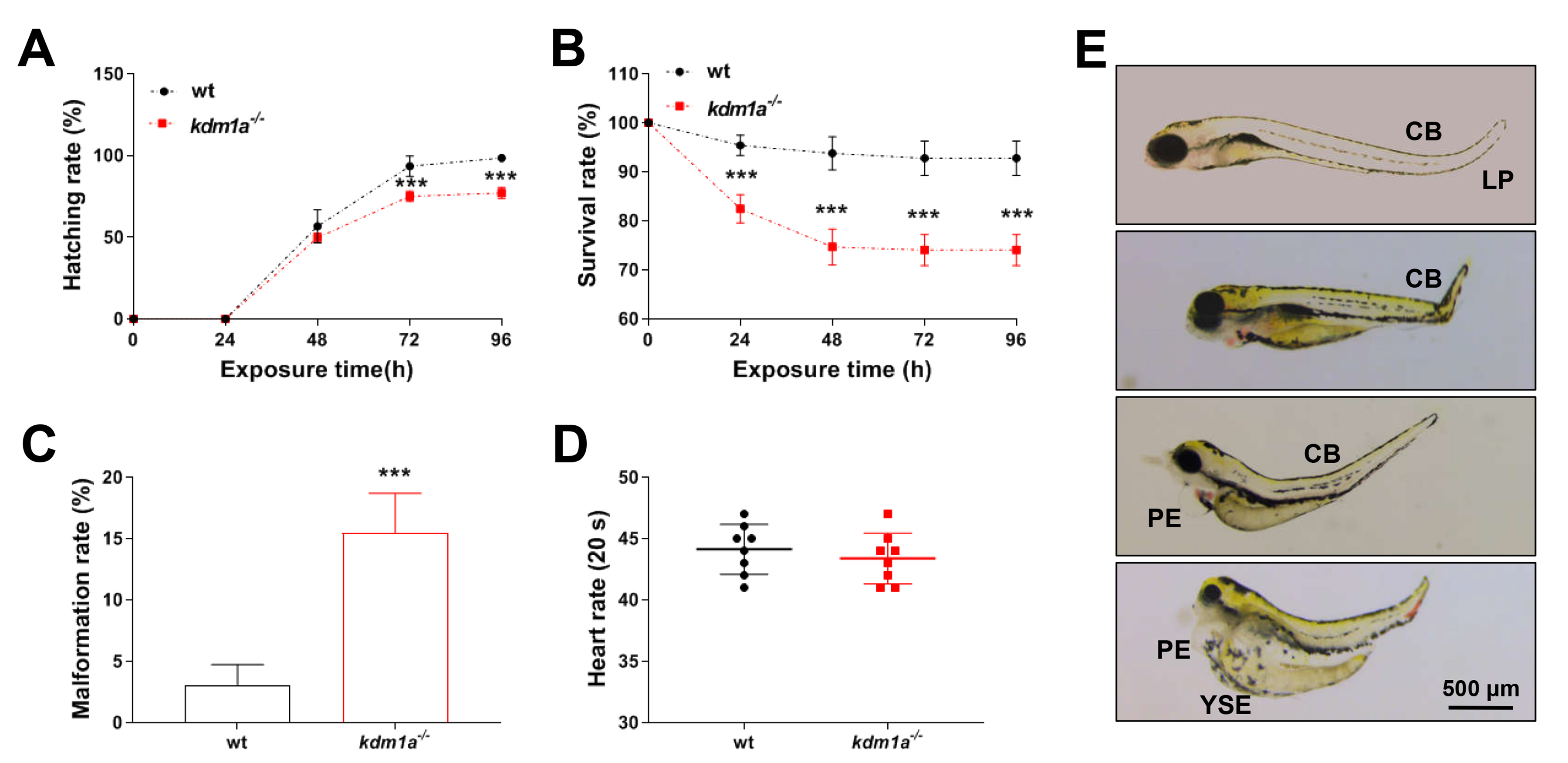 To investigate the role of kdm1a in developmental abnormalities, we firstly analyzed the hatching rate, survival rate, heart rate and malformation rate. The hatching and survival rates of kdm1a-/- zebrafish decreased significantly after 48 hpf (Fig. 2A,B). While the malformation rate increased in kdm1a-/- zebrafish (Fig. 2C). No significant changes in the heart rate were observed in the kdm1a-/- group at 72 hpf (Fig. 2D). The typical morphological alterations mainly included pericardial edema (PE), yolk sac edema (YSE), curved body (CB) and low pigment (LP) (Fig. 2E).