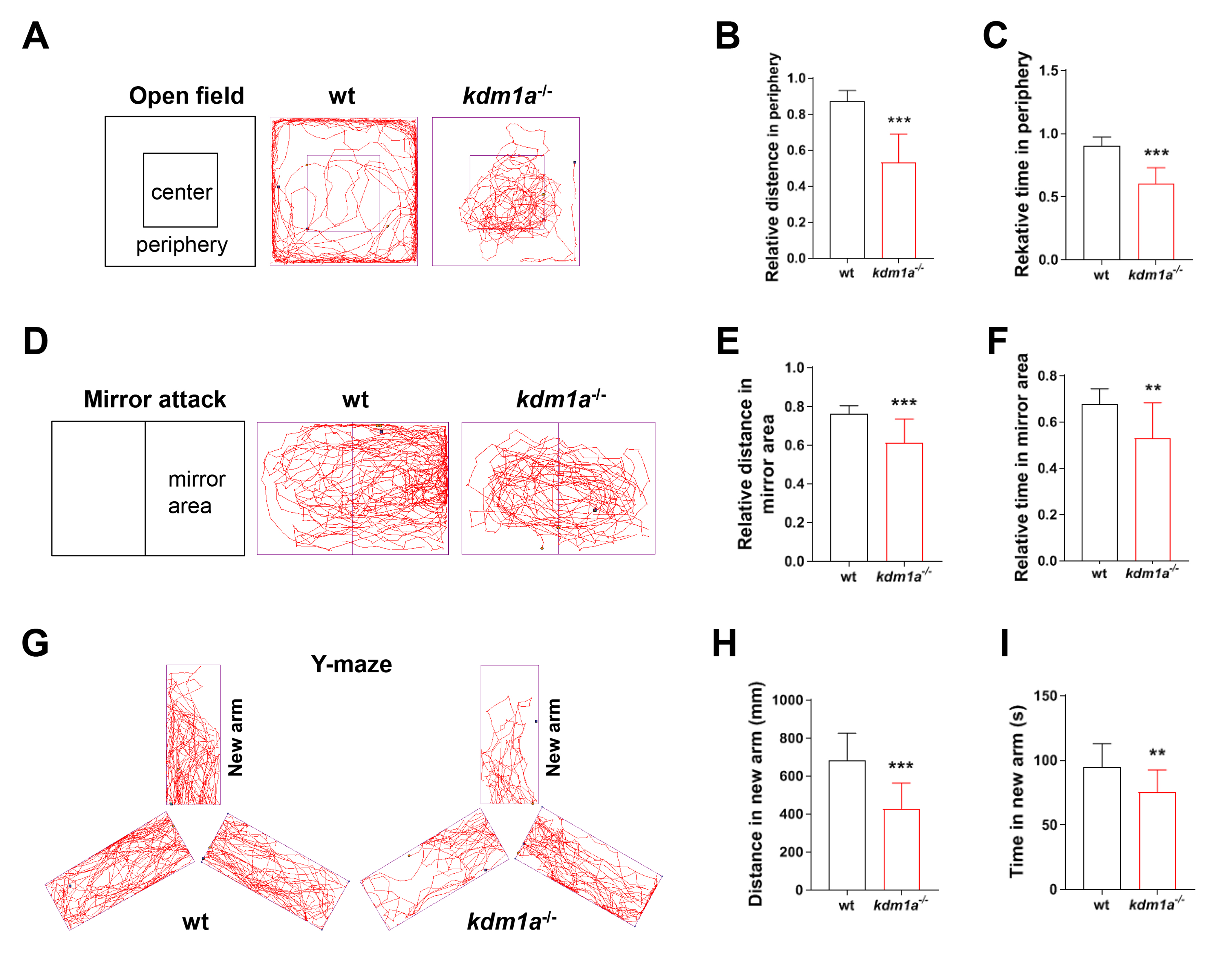 To better understand the cognitive abilities of kdm1a-/- zebrafish, the Y-maze test was employed to analyze the time and distance in the novel arm. The locomotion tracking pattern illustrated the differences in swimming traces in Y-maze arms (Fig. 3G). As a result, significant decreases in the time and distance spent in the novel arm were observed in kdm1a-/- zebrafish (Fig. 3H,I), suggesting that cognitive ability, particularly learning and memory, was impaired in kdm1a-/- zebrafish.
