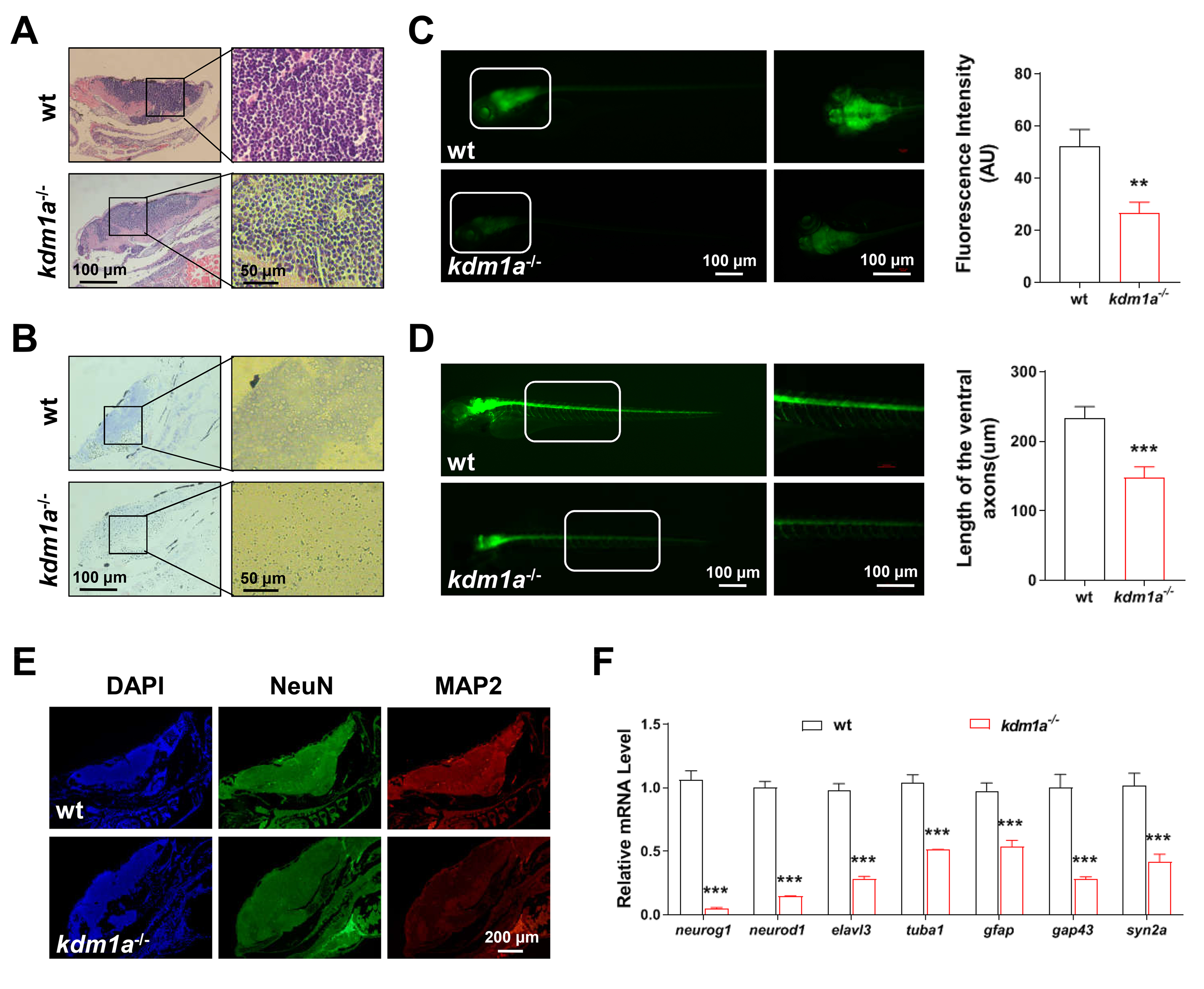 Neurobehavioral deficits are closely associated with neurogenic disruption. Interestingly, the HE and Nissl-stained sections revealed that kdm1a-/- zebrafish had significantly fewer neuronal cells than the control group, suggesting that loss of kdm1a causes neurogenic impairment, which may lead to morphological and behavioral abnormalities. The results of this study follow previous findings demonstrating that neural cell death assessed by Nissl staining has a detrimental effect on animal behavior [44].